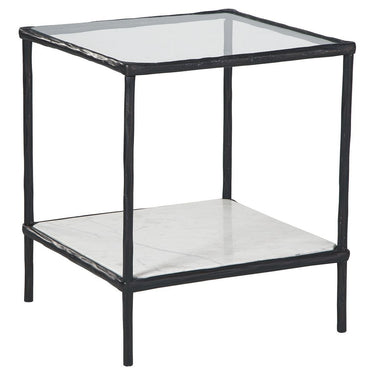 Classic in design with a dash of textural appeal, this accent table provides both flair and function. The glass tabletop offers the perfect perch for a lamp, while the white marble lower shelf is ideal for resting trendy coffee table books and other decorative pieces. An antiqued black finish on the frame has an edgy look that remains versatile, suiting spaces from casual to contemporary.