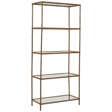 Classic in design with a dash of textural appeal, this bookcase provides endless possibilities for displaying your decor. Five shelves offer the perfect perch for potted plants, books or your favorite framed artwork. The frame's antiqued brass-tone finish has a rustically luxe look that remains versatile, suiting spaces from casual to contemporary.