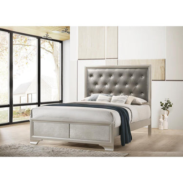 Transform your sleeping quarters into a glamorous haven. with a glimmering, metallic sterling finish, this transitional bed lends stunning elegance to any bedroom. tufted with sparkling bling buttons, its design is enlivened with striking, modern opulence. a charcoal grey leatherette upholstered headboard creates a soft, stylish effect. crafted for quality, this asian hardwood bed offers sturdy durability and comfortable support.