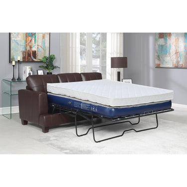 All the earmarks of a classic join in this singular sofa sleeper. ideal for a multi-purpose living space, this elegant piece adds a delightful touch as an anchor for a seating ensemble or a standalone unit. premium breathable leatherette in beautiful dark brown is both versatile and dramatic. charming tufting on its back cushions and track arms adds a stylish touch. with coordinating cappuccino finish legs, its bold aesthetic makes a perfect choice for a central space.