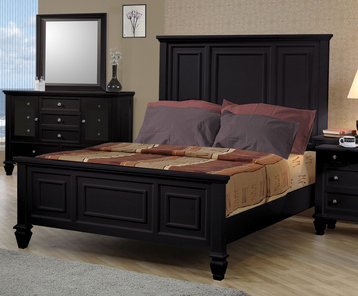 A showcase of the sandy beach bedroom collection, this coastal california king offers a regal appearance. it is designed to be the showcase piece of any master bedroom. crafted from tropical hardwoods in an imperious black finish. both the headboard and footboard feature clean carved lines and detailed moldings. bed is also available in rich cappuccino or chic white.