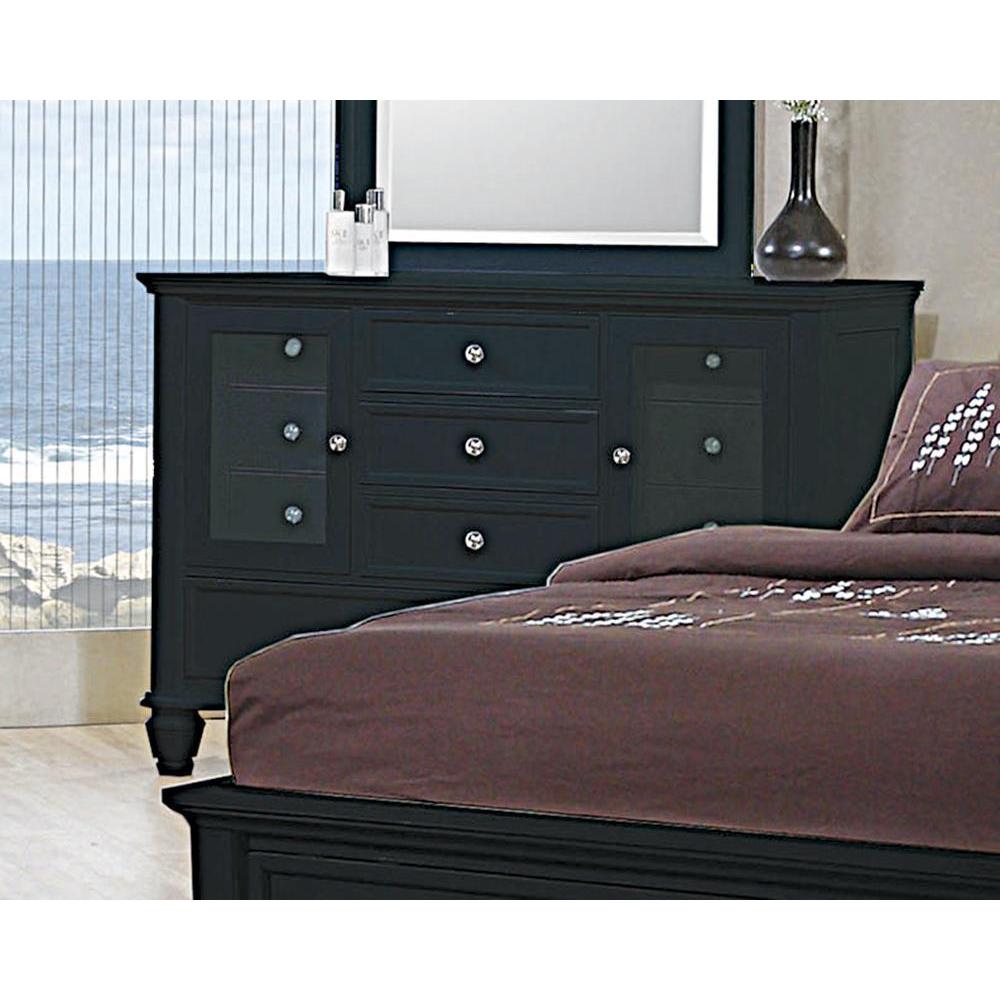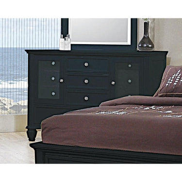 An integral piece of the sandy beach collection is this sturdy yet elegantly-styled dresser. wide, broad top is spacious enough for fresh flowers and an impressive perfume collection. fine craftsmanship features detailed lines and moldings that give the dresser a courtly appeal. features five easy-access drawers for plenty of storage for all your foldable delicates. two glass doors each open to smaller three smaller drawers that are perfect for storing valuables like necklaces and fine watches.