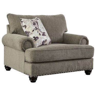 Try transitional style on for size with this generously scaled oversized chair. Classic elements like turned bun feet are merged with modern touches including black nickel-tone nailhead trim, making this indulgent chair equally at home in vintage-inspired and contemporary settings. Cobblestone tone upholstery has a chunky chenille look and feel for earthy elegance at its best.