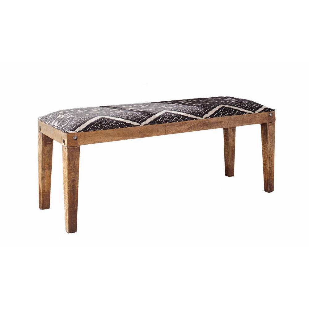 Charming and contemporary, this modern natural bench emits a slightly rustic aura. the warmth of the wooden frame is enhanced by an exposed wood grain with decorative nail head details above the legs. fun and bold, the seat features a geometric pattern in black and white. read a book or dress up a hallway with the elongated, scandinavian-inspired silhouette. full of clean lines with subtly tapered legs, this bench is sure to make a statement.