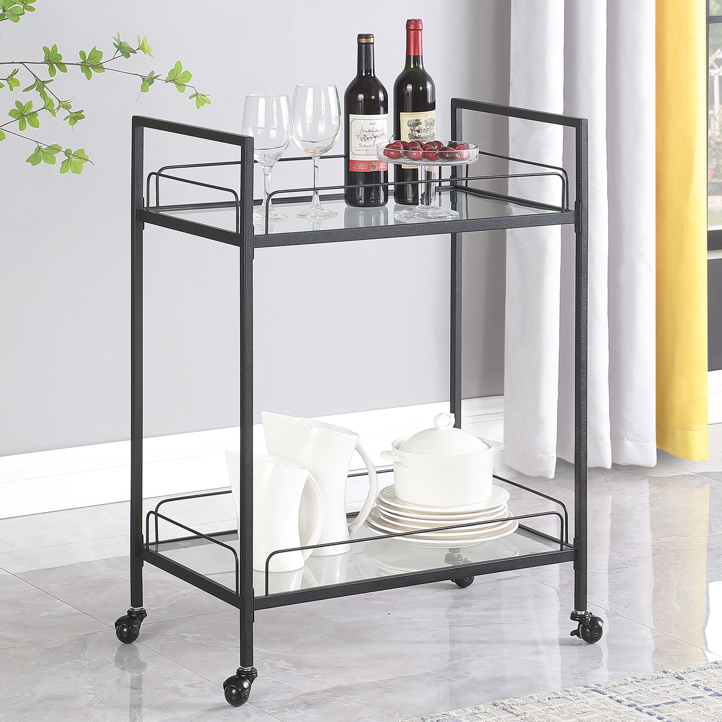 Minimal, clean lines create a versatile and sleek aesthetic to this contemporary serving cart. built with a slim metal frame in a black hammertone powder coated finish with caster wheels, this serving cart welcomes glassware, accessories and snacks to be smoothly transported to an entertaining area for guests and visitors. stacked clear tempered glass shelves showcase stemware and favorite vintages to guests for their personal selection. with raised edges, you can rest easy knowing everything stays in place safely. glide this serving cart into your living room for small get-togethers or keep it in a compact apartment as a multifunctional bar cart.