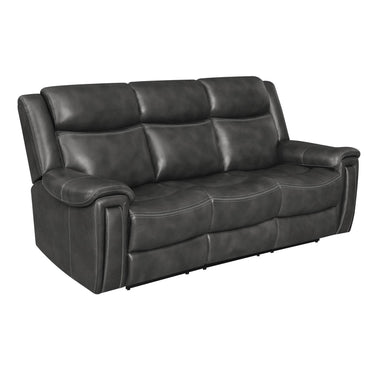 Perfect for a spacious entertainment room, this power reclining sofa features a hand rubbed, charcoal top grain leather that's incredibly supple to the touch.arms and headrests have white stitching details for contrast.this sofa also offers a wall hugger mechanism so you don't have to accommodate extra space.digital control panel display, integrated bluetooth speakers, along with dual usb outlets provide everything you need to relax for hours at a time.place this recliner sofa in a contemporary or transitional home for comfortable seating.