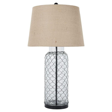 Wired and inspired. This designer table lamp with transparent glass base is wrapped with woven wire for a fresh twist. Modified drum shade in a textural linen-weave fabric tops off this table lamp in naturally cool style. Whether your aesthetic is coastal chic, modern farmhouse or cottage quaint, you're sure to delight in the warmth and beauty of this on-trend table lamp with convenient 3-way switch.
