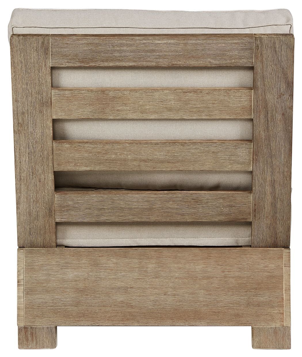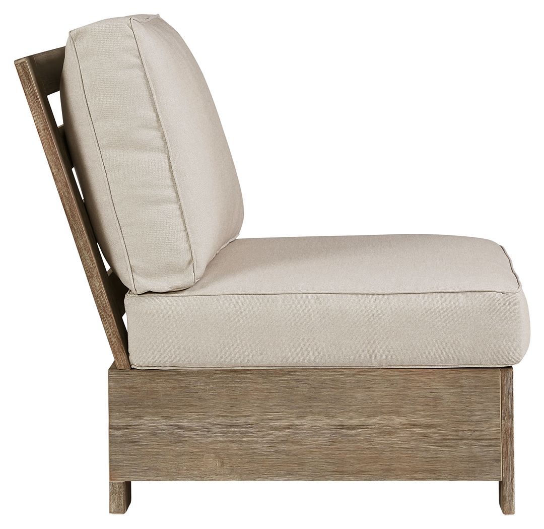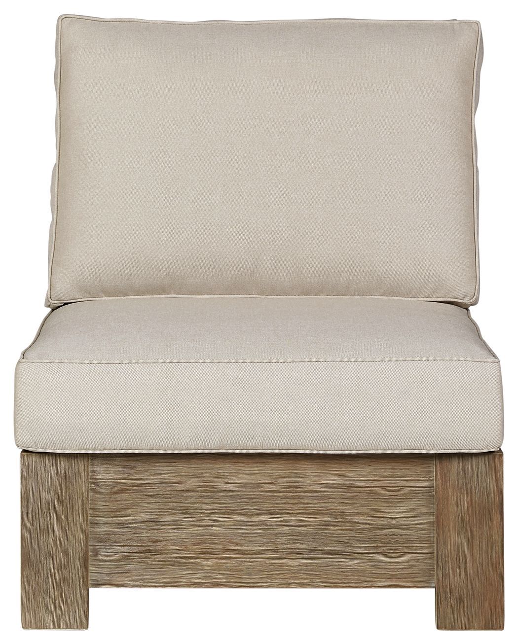 Beautifully on point, this outdoor armless chair is the natural choice for modern minimalists who know that less is more. Quality crafted of eucalyptus wood, the ultra clean-lined frame is enriched with a multi-step embossed finish that both brings out the wood's natural grain and protects it from the elements for seasons of fun in the sun. Rest assured, the chair is topped with thick seat and back cushions wrapped in our exclusive Nuvella� high-performance fabric that's fade resistant, stain resistant and a breeze to clean. Combination of a light, neutral fabric and natural wood makes a high-style understatement.