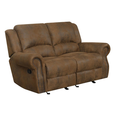 Enjoy soft, soothing comfort and maximum durability. this magnificent glider loveseat is covered in brown microfiber for a soft, luxe feel. its cushions are thick and padded for even more relaxation. individually placed nail heads add a touch of traditional style and taste. crafted from high-quality materials, this loveseat is an excellent choice for a family room, parlor, or den.