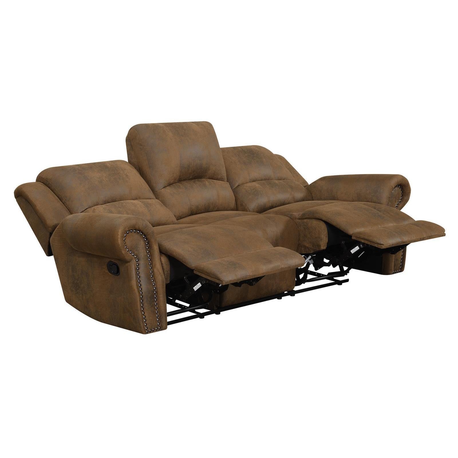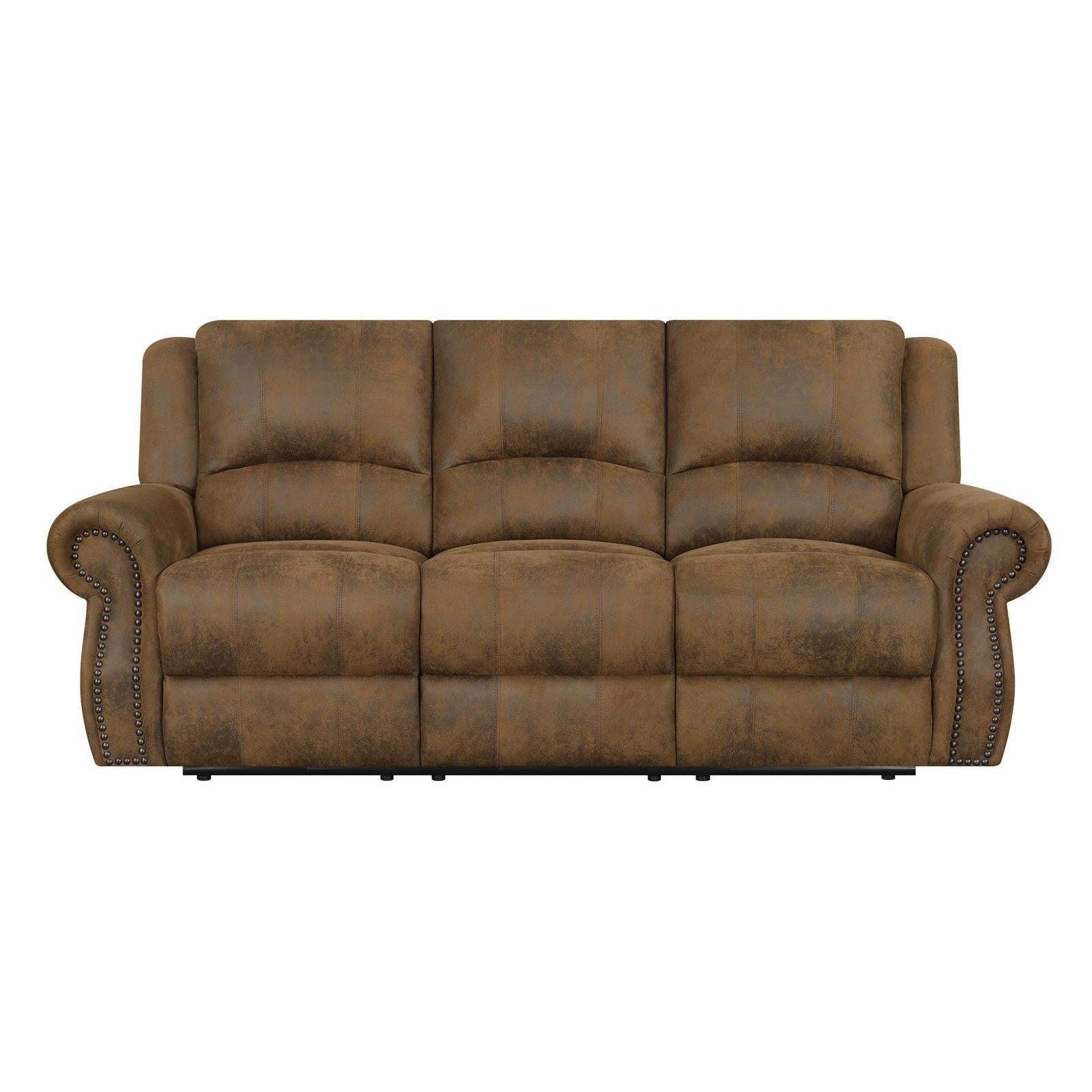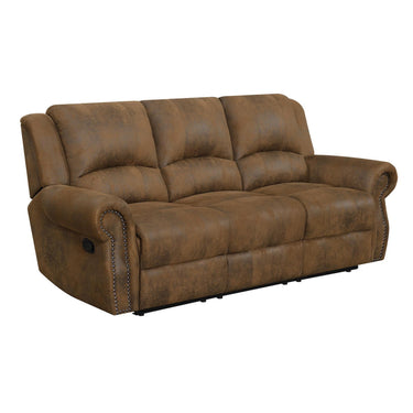 Stylish and durable, this classic motion sofa looks great in a traditional space. sleek and warm, the buckskin coated microfiber upholstery exudes comfort. a luxurious nail head trim gleams of metallic details. plush cushions on the seat and back offer head and lumbar support while remaining classy. relax in style with the look of clean rolled arms.