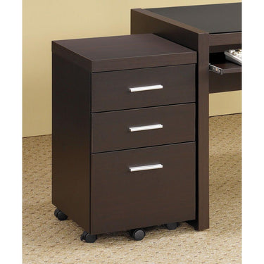 Add no-nonsense glamour and functionality to a den, office, or even a bedroom. with casters built in, this file cabinet can be easily transported from room to room. its cappuccino finish blends elegantly with silver handles, adding attractive appeal. crafted from top quality materials, this cabinet is as sturdy as it is stylish. it combines perfectly with a desk to create a convenient workstation.