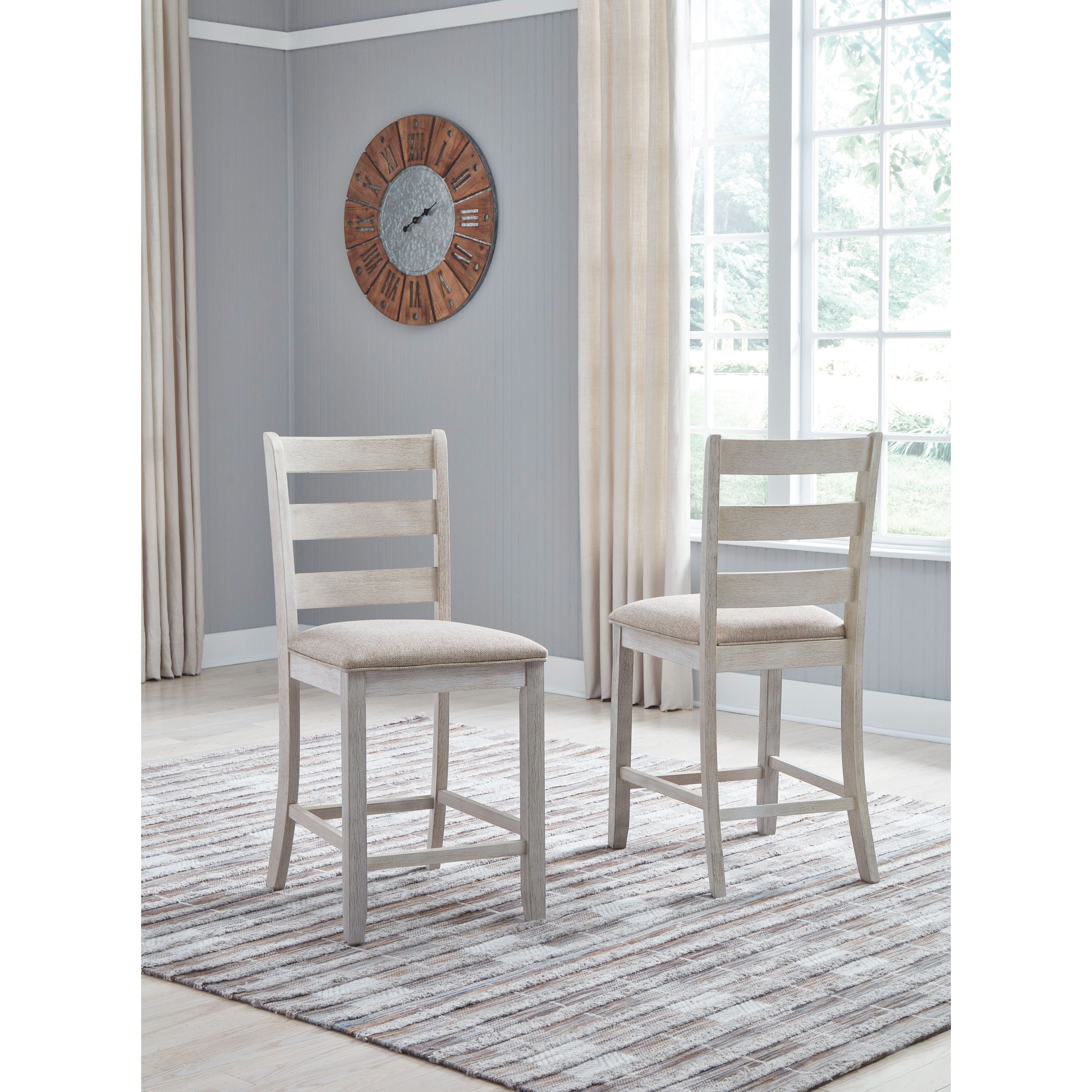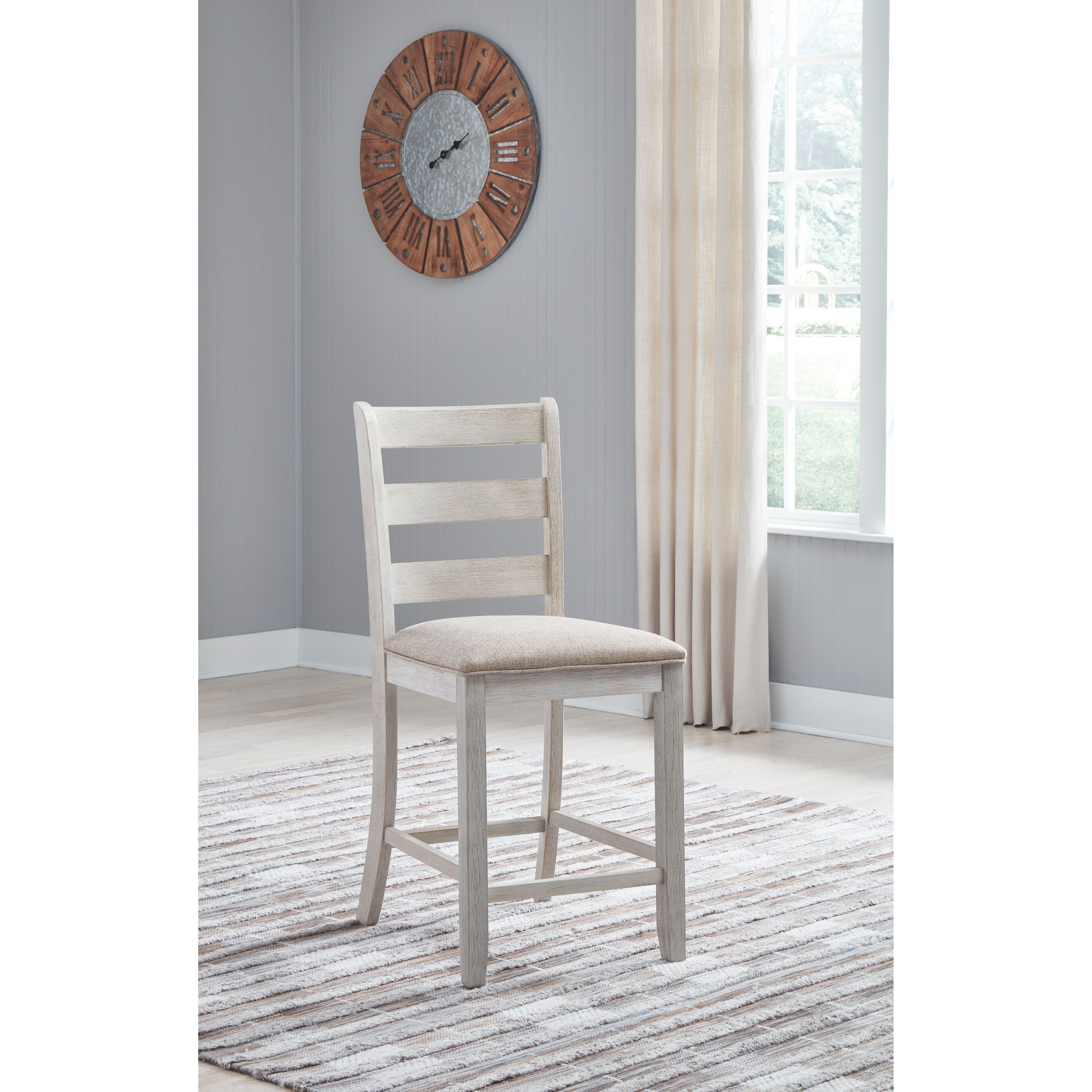 This upholstered bar stool invites you to raise the bar on small space living. An inspired choice for coastal chic or modern farmhouse settings, this comfortably cushioned bar stool with classic ladderback styling sports a grayish white finish with rub through effect for timeworn appeal.