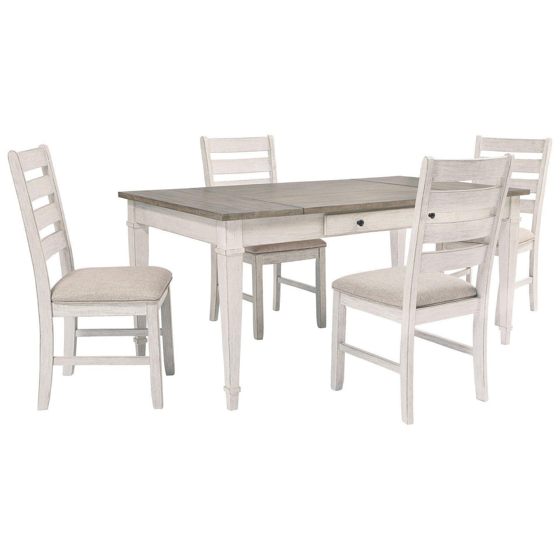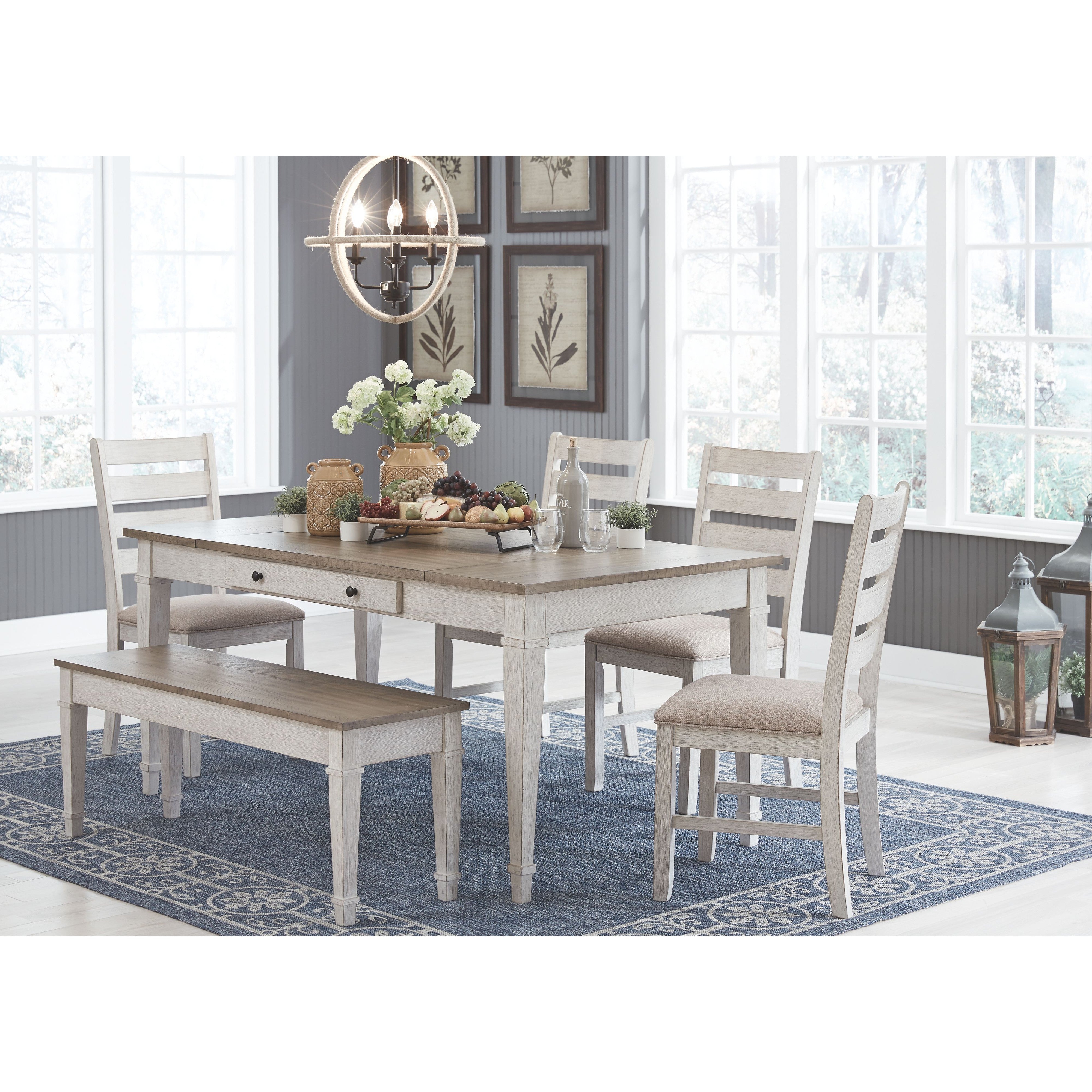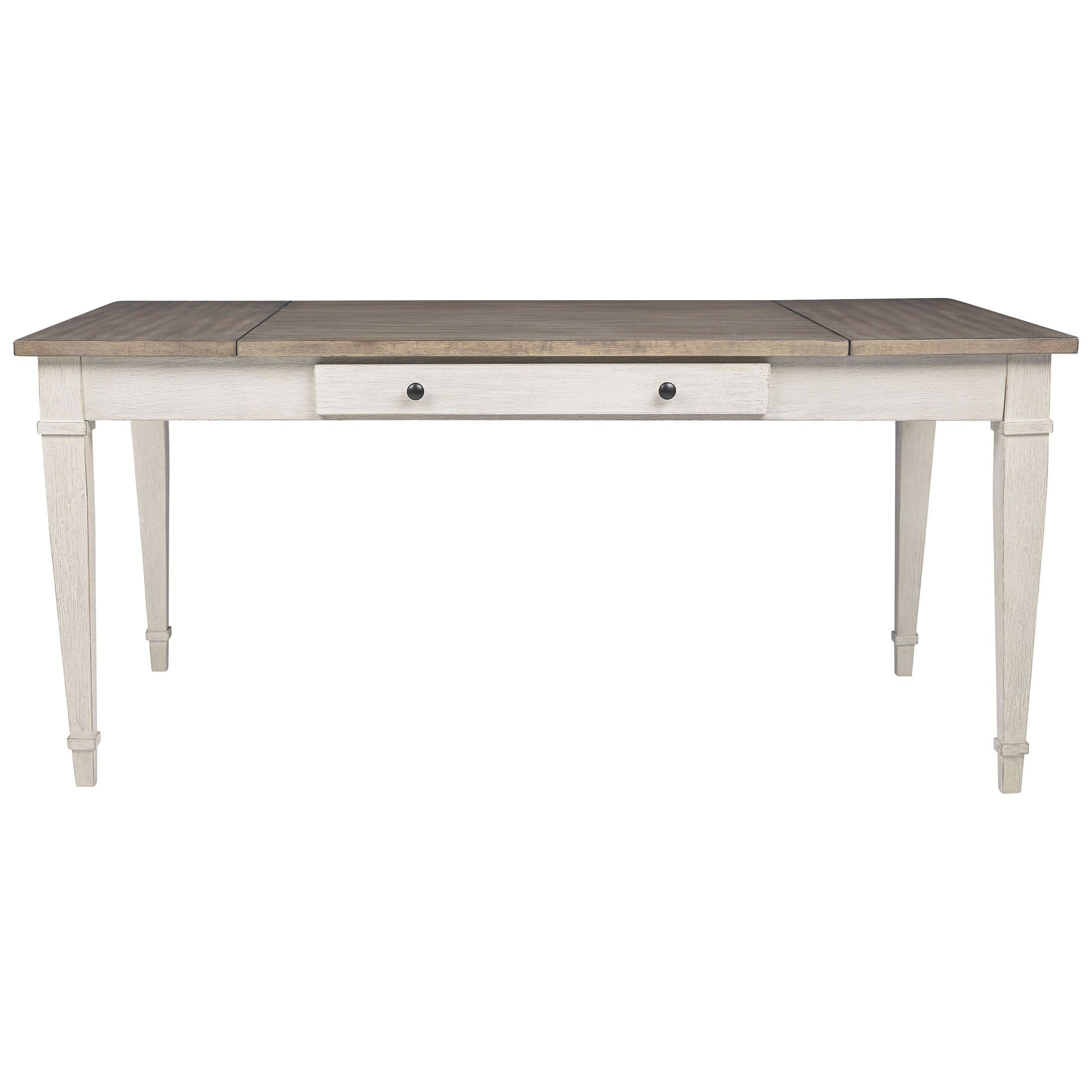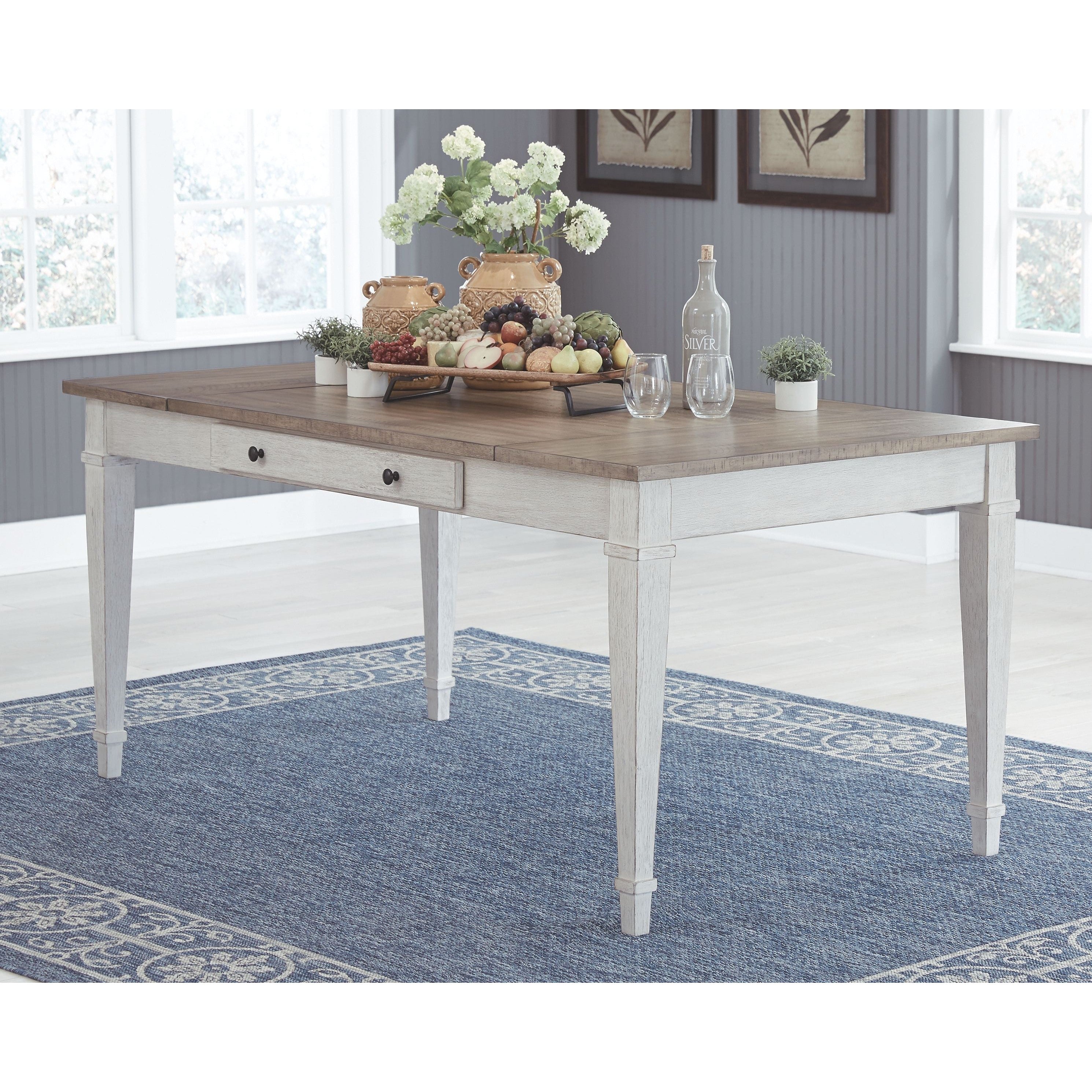 Set the scene for coastal chic or modern farmhouse living with this dining room table. Clean-lined, simply striking table doubles the charm with a brown tone top with plank effect, paired with a grayish white base with rub through effect for timeworn appeal. Multi-functional dining table features two convenient side drawers and a storage bin on each end for maximum use of space. Styled to comfortably seat six, this table makes room for one and all.
