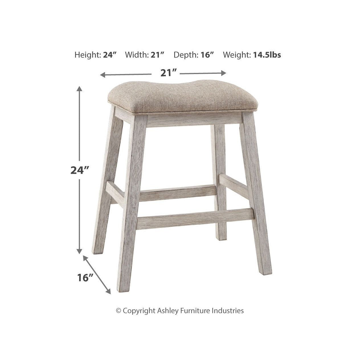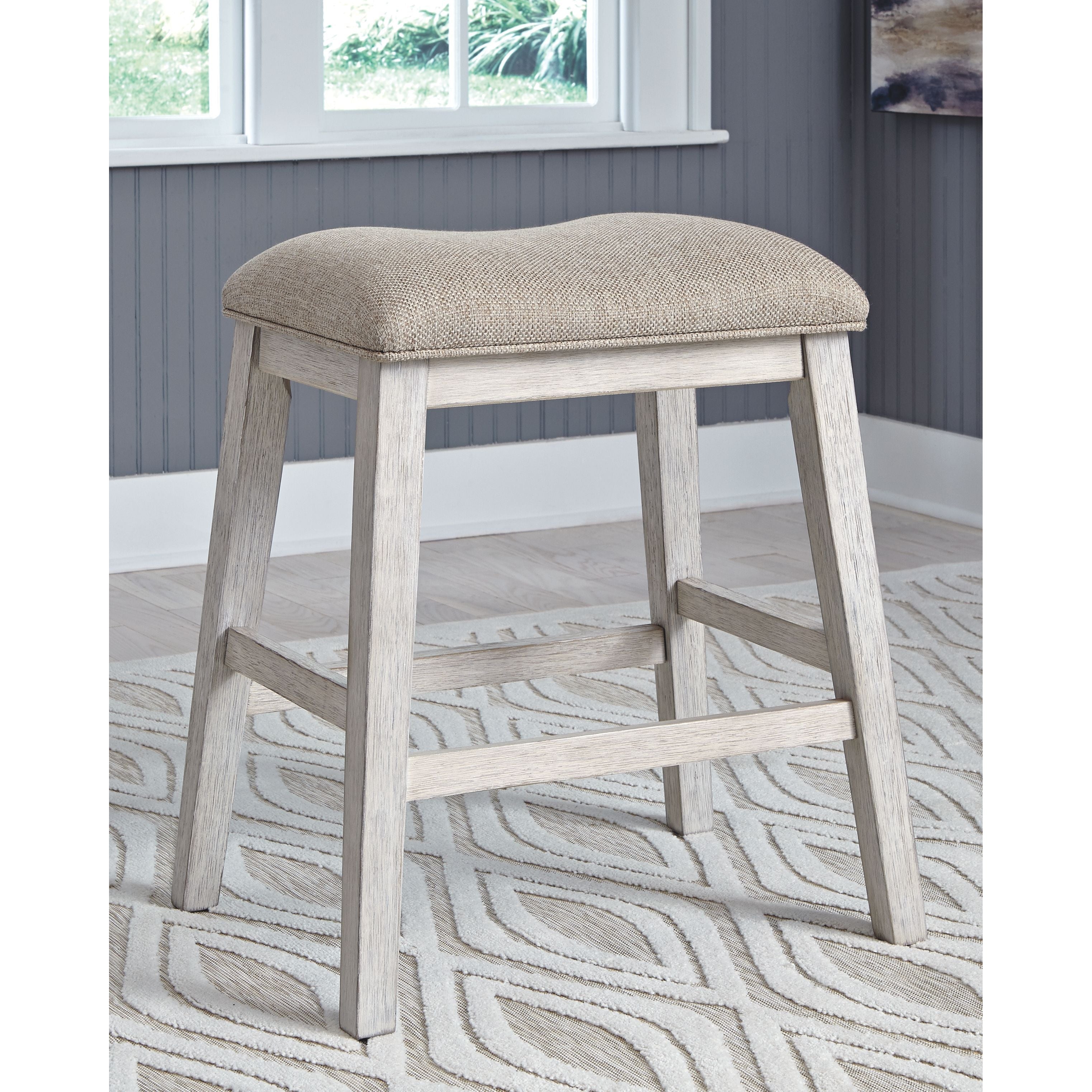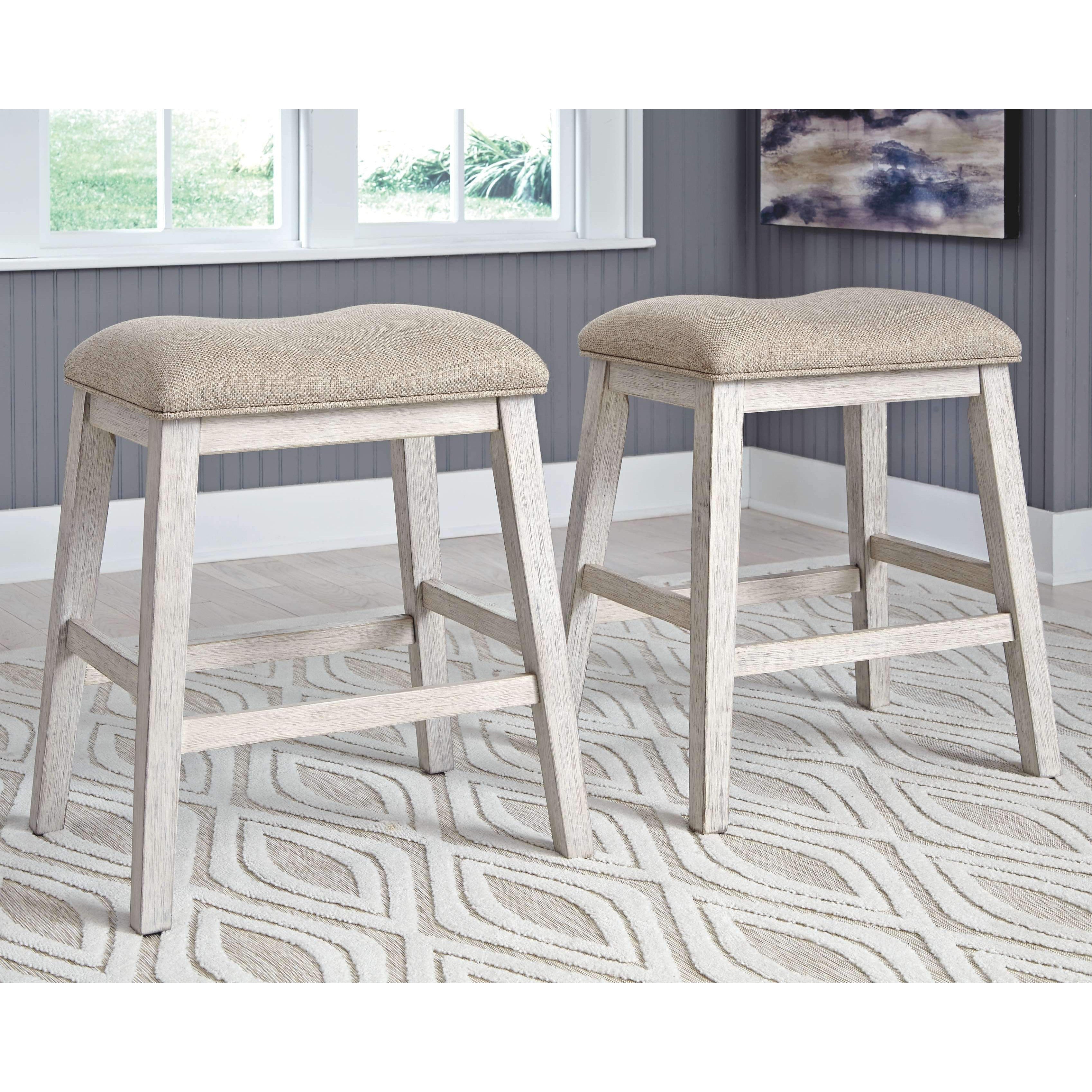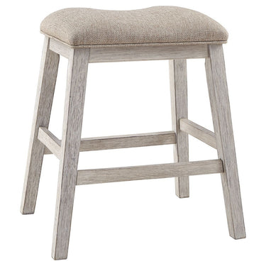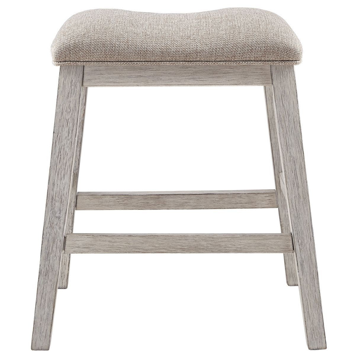 This upholstered stool invites you to raise the bar on small space living. An inspired choice for coastal chic or modern farmhouse settings, this comfortably cushioned stool sports a grayish white finish with rub-through effect for timeworn appeal.