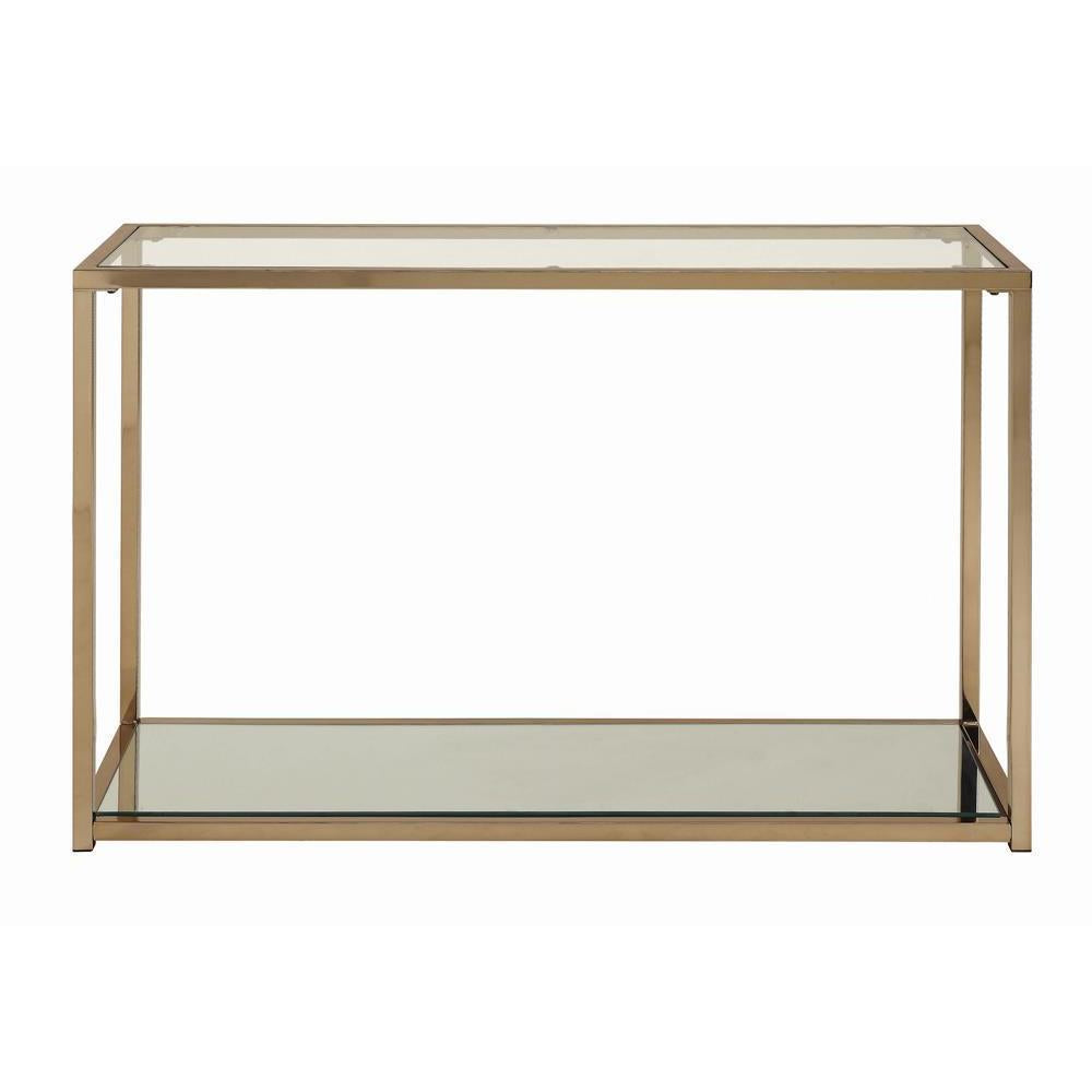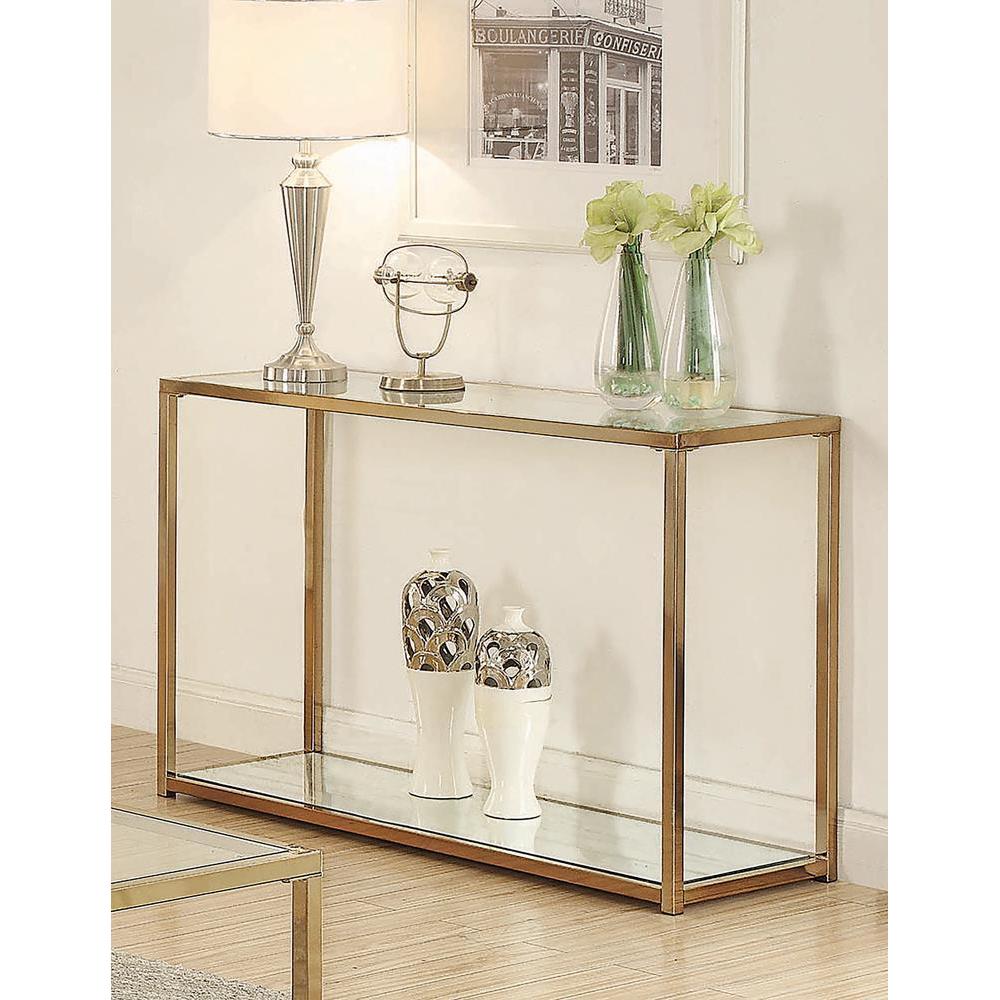 This rectangular glass and chrome sofa table is an impressive addition to the home. a rectangular glass table top offers space for a decorative lamp and fresh flowers. a glass bottom shelf adds room for contemporary style vases or sculptures. the sturdy table frame is stylishly finished in chocolate chrome that's beautifully muted. it's chic enough to stand alone against the wall of the den or backed up against a contemporary sofa.