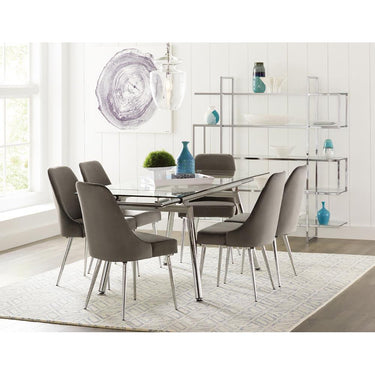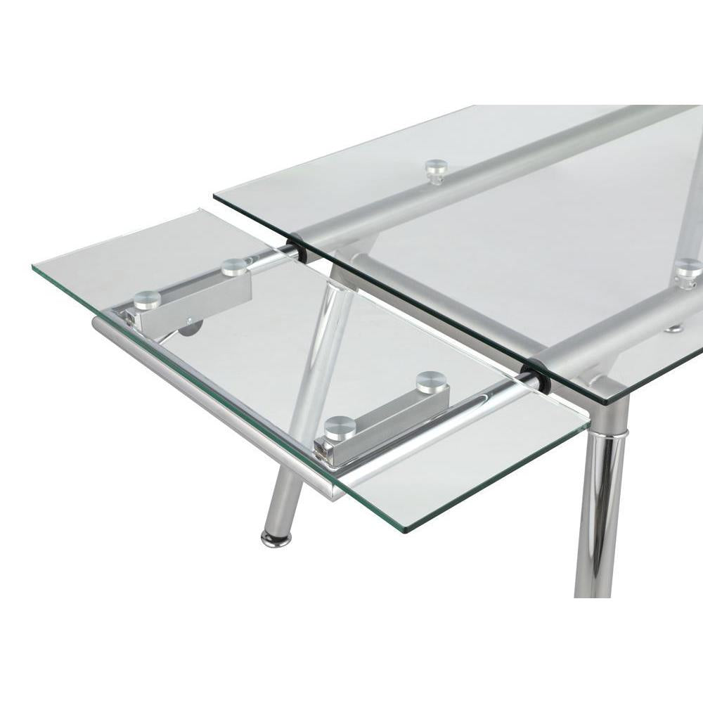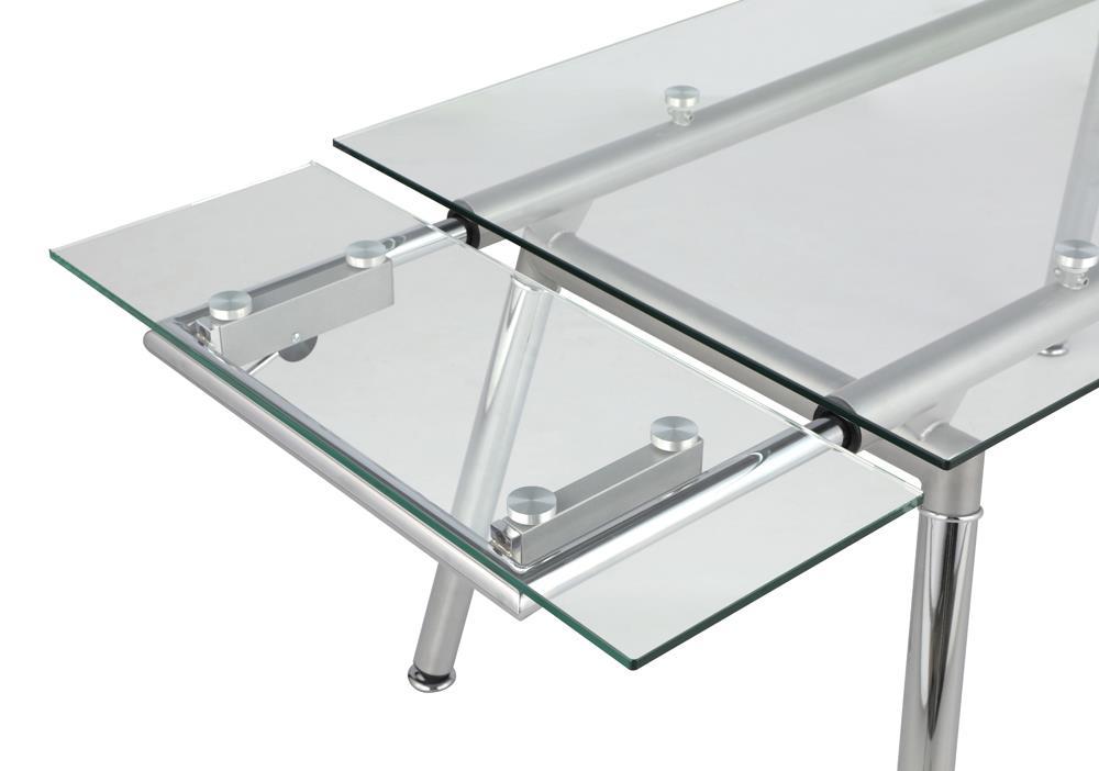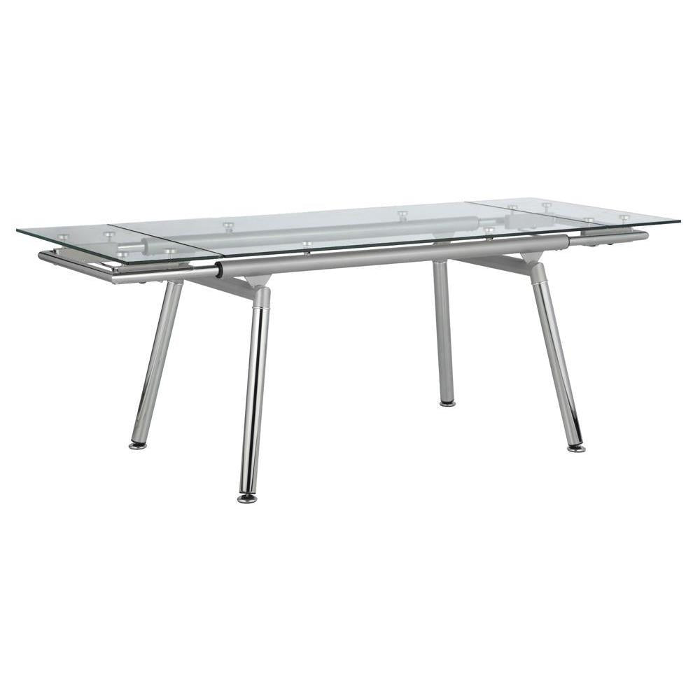 Ultra-modern with a sleek design aesthetic, this dining table is perfectly suited for modern style dining spaces. capable of seating six guests comfortably, with plenty or elbow room, this spacious table features two 12-inch leaf extensions, one each end, that allow for last-minute dinner guests. topped with a transparent, thick tempered glass tabletop surface, it offers an open and airy design that allows rugs and chair colors to take center stage. to add to the chic contemporary flair is a shiny electroplated metal finish that lends a touch of glam. add this dining table to a dining room or media room for family gatherings, game night and more.