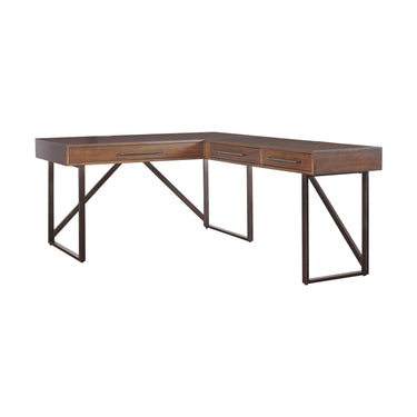 Made with Acacia veneers, rendered in an oiled Walnut coloration for a deep woody finish. Designed with a clean lined modern appearance. Metal frames have a bronze color finish. H633-34/34R have braced metal legs in a bronze color finish. L-desk configuration. The return can be removed to use the main desk alone.