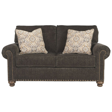 Everyone can have the best seat in the house with this loveseat. Nailhead trim puts the finishing touches on the traditional roll arms you love. Reversible seat cushions with high-pile chenille fabric keep your loveseat feeling plush. Old world-inspired jacquard pillows add another layer of comfort. Turned feet in burnished light brown finish show that style and quality flow from top to the bottom.
