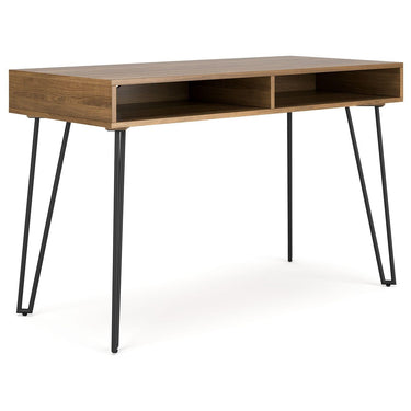 Sporting a sleek and simple profile, this home office desk is casual contemporary at its finest. The desktop is wrapped in a replicated brown wood grain and paired with decidedly mid-century style black legs for a familiar-yet-fresh design. And with two included open storage areas and a cord management raceway, this desk elevates your at-home workspace with both function and fashion.