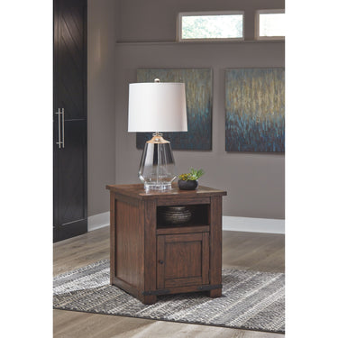 Rustic beauty and functionality ensue with this rectangular end table. Its farmhouse style garners attention with distressed rustic finish and black metal accents. You'll love the extra room in the cubby and lower cabinet for stashing items. What's more, a convenient AC power supply with two USB charging ports is located in the top of the cubby—perfect for keeping your cell phone or laptop charged without having to get up from your seat.