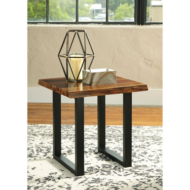 Enjoy the authentic look of “live” edge wood furnishings minus the hefty price tag with this striking end table. Rich, natural wood finish top, crafted with acacia veneers, is a look with real staying power. The dramatically cool “sled” legs add a contemporary vibe perfect for your urban loft or boho abode.