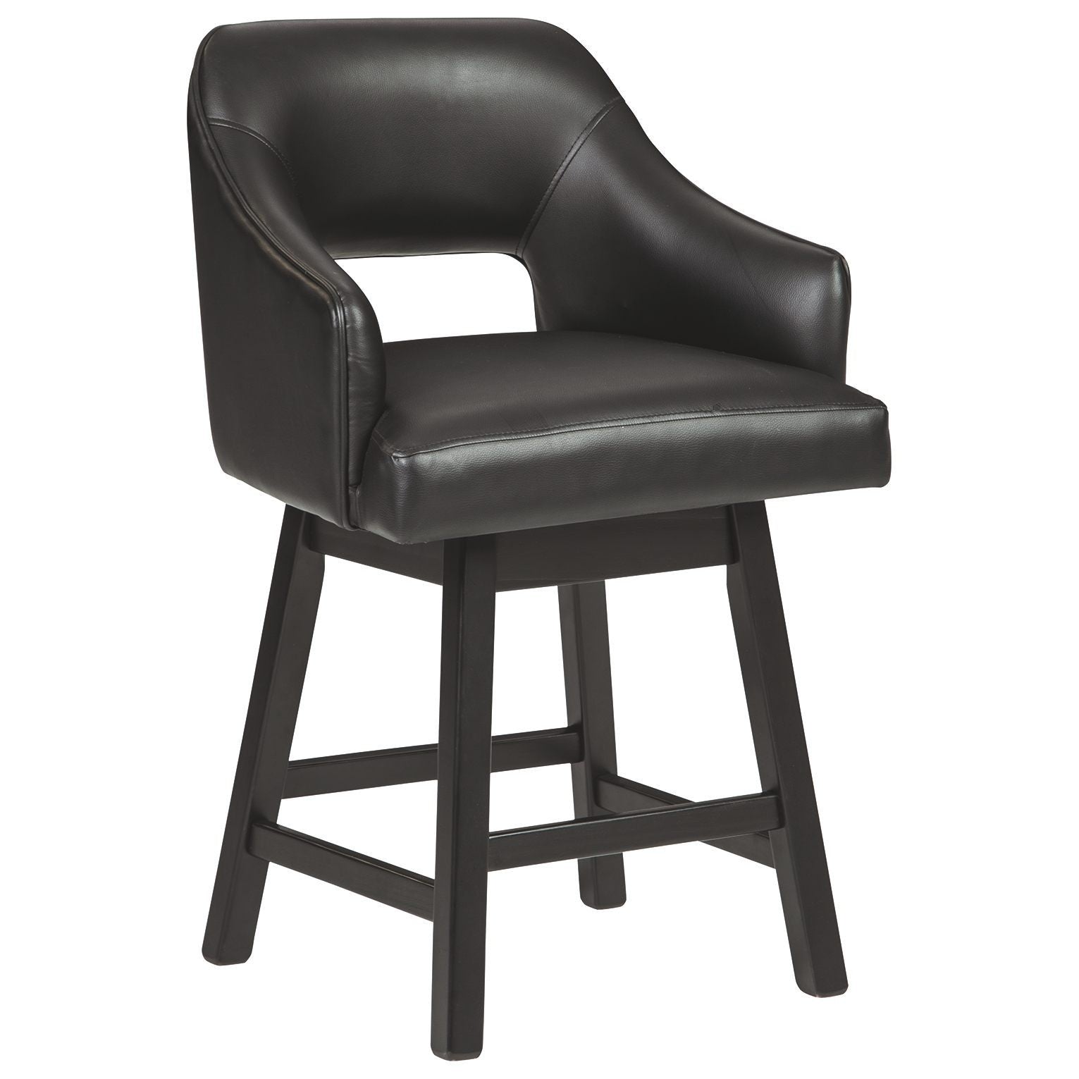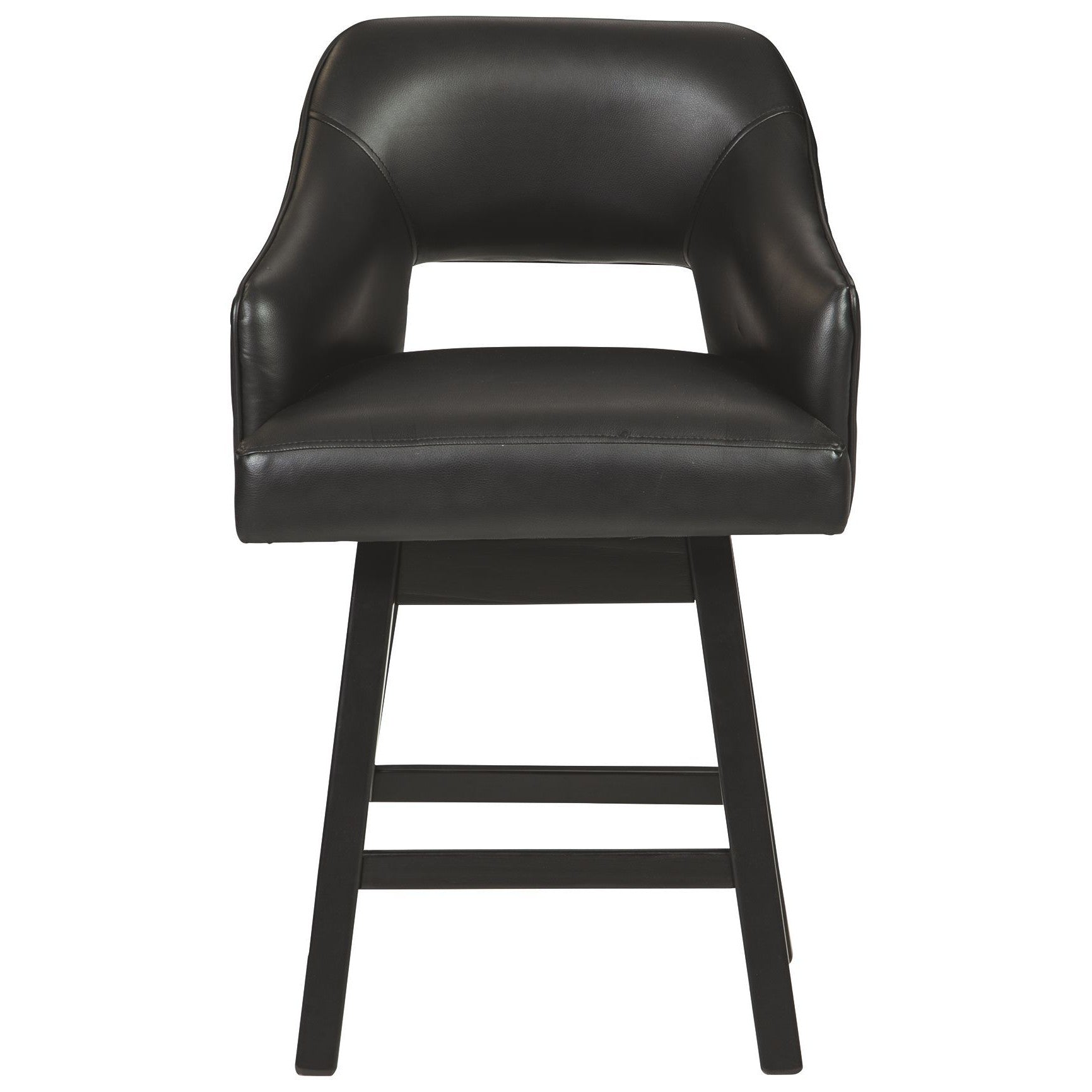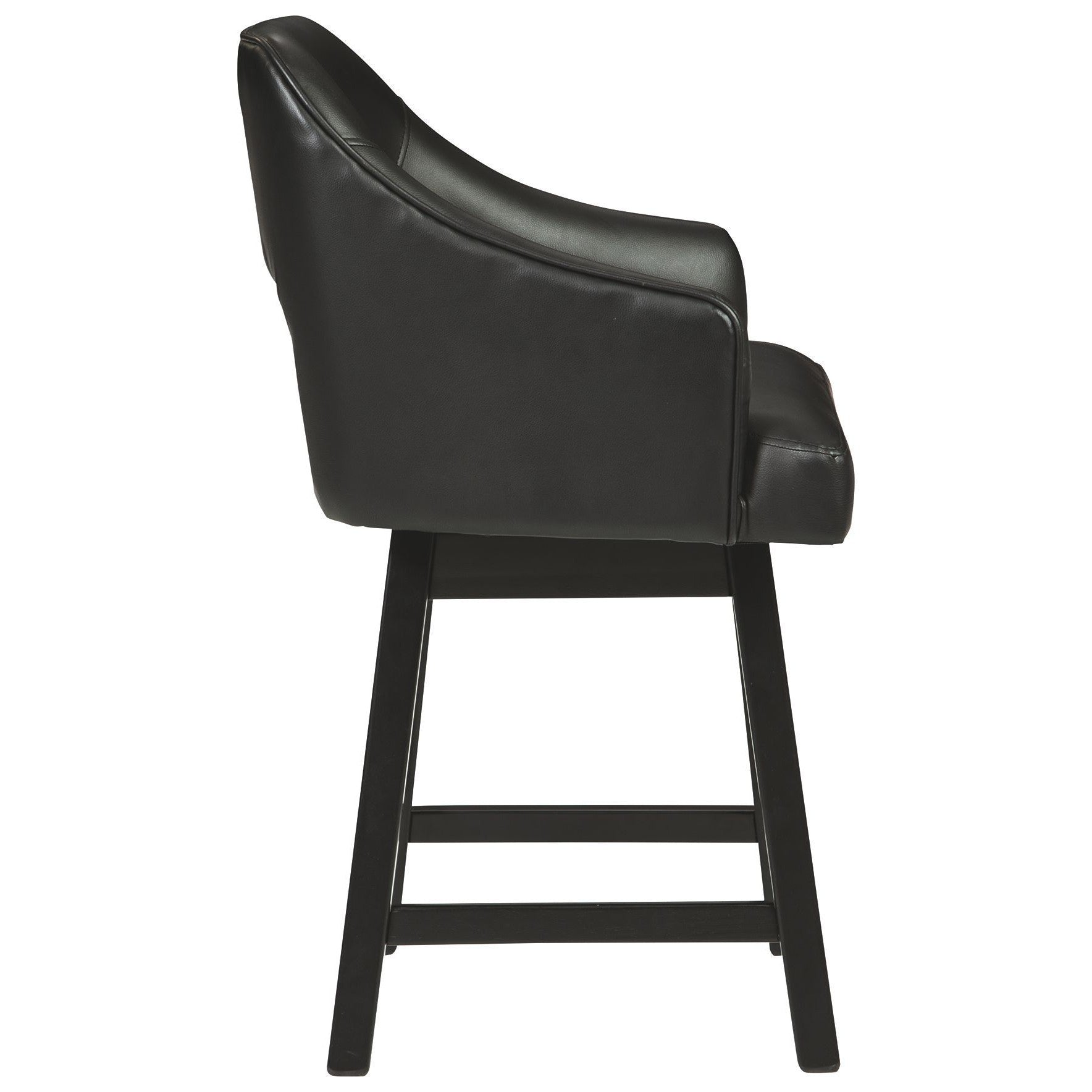 This striking barstool invites you to take contemporary modern style for a spin. Comfortably cushioned seat, self-returning swivel and contoured back make it beautifully in tune with your needs. Luxurious faux leather upholstery is a sensational touch.