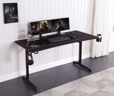Immerse yourself in the battle with this contemporary gaming desk. designed with a carbon fiber textured desktop, complete with a custom tailored full coverage removable mouse pad, this gaming desk has all the bells and whistles a gamer will appreciate. this minimal desk also features a convenient built-in dual headset hook and cup holder to keep gear organized and within reach. plus, you can rest assured your area doesn't clutter with cables, using the two cable management grommets and handy socket holster. a gamer rack keeps your controllers and games all neat and organized too, while four usb outlets ensure all your devices are good and charged.