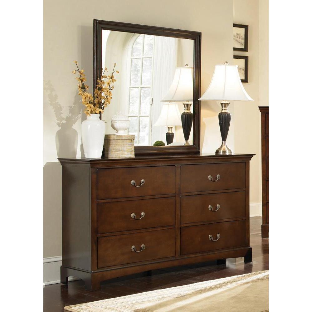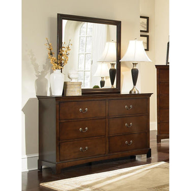 Rich color and sleek design make this six-drawer dresser a stunning addition to any bedroom. crafted in a warm brown finish, the classic silhouette is upgraded with a slight wood grain texture. metallic hardware radiates against smooth and clean lines. okume veneer and tropical wood mingle to give this piece its timeless personality. showcase and store clothes in clean and classy style with the dovetail construction.