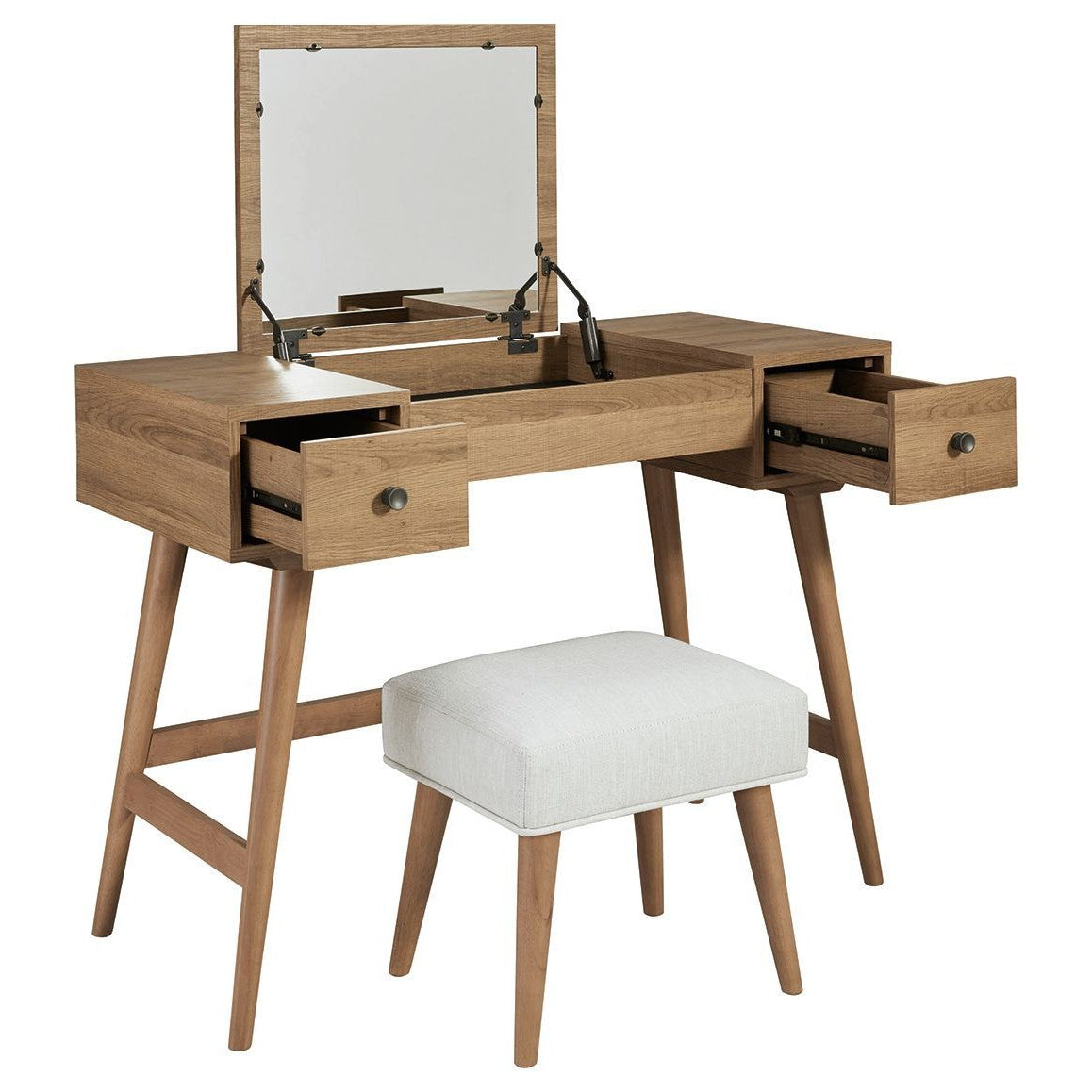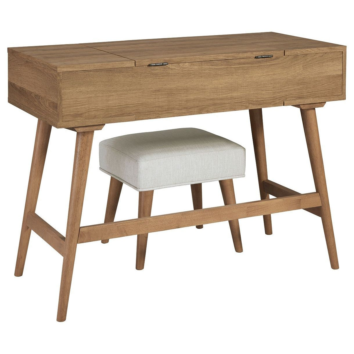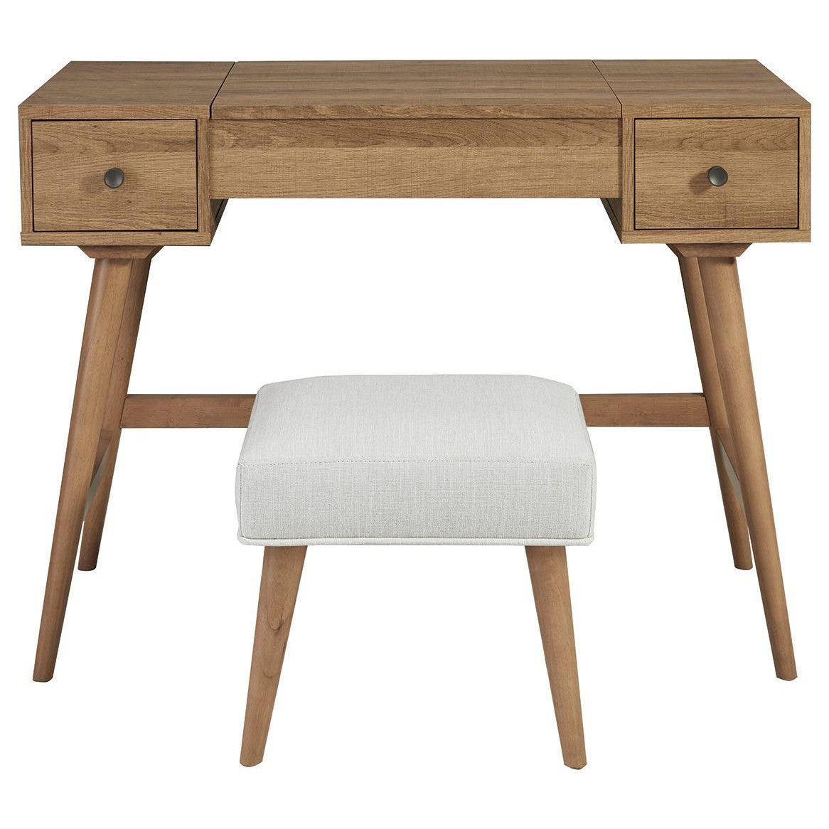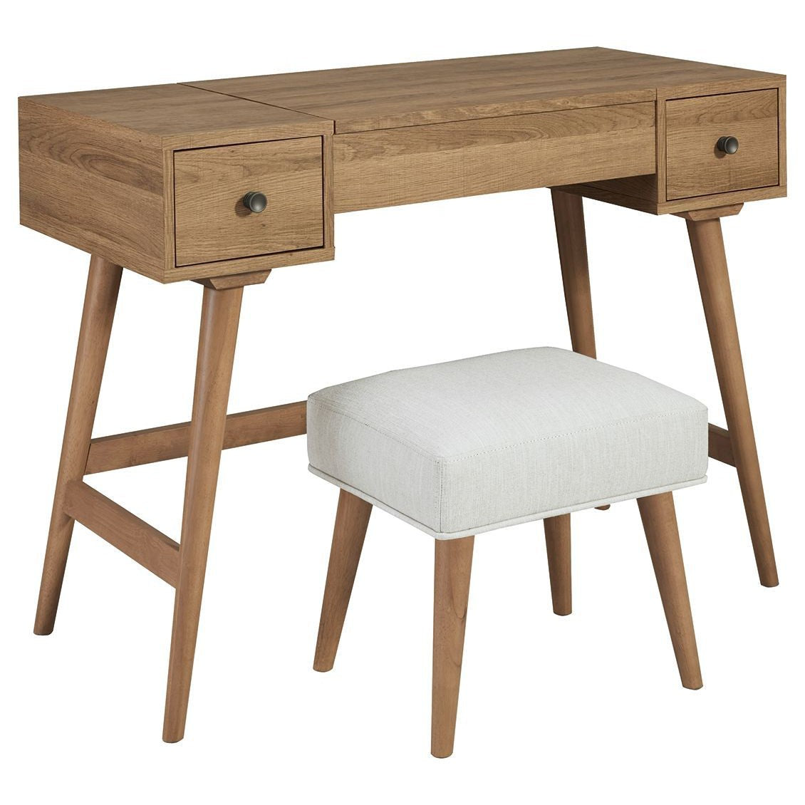 Whether in a teen's room, master bedroom or dressing area, the mid-century inspired design of this vanity set in light brown is packed with possibilities. The flip-top design makes it doubly handy as a vanity or writing table; flip it up for access to hidden storage and a mirror, and flip down for a flat work surface. Two smooth-gliding drawers offer additional storage for makeup and beauty essentials, while the sumptuously upholstered seat makes the experience complete.