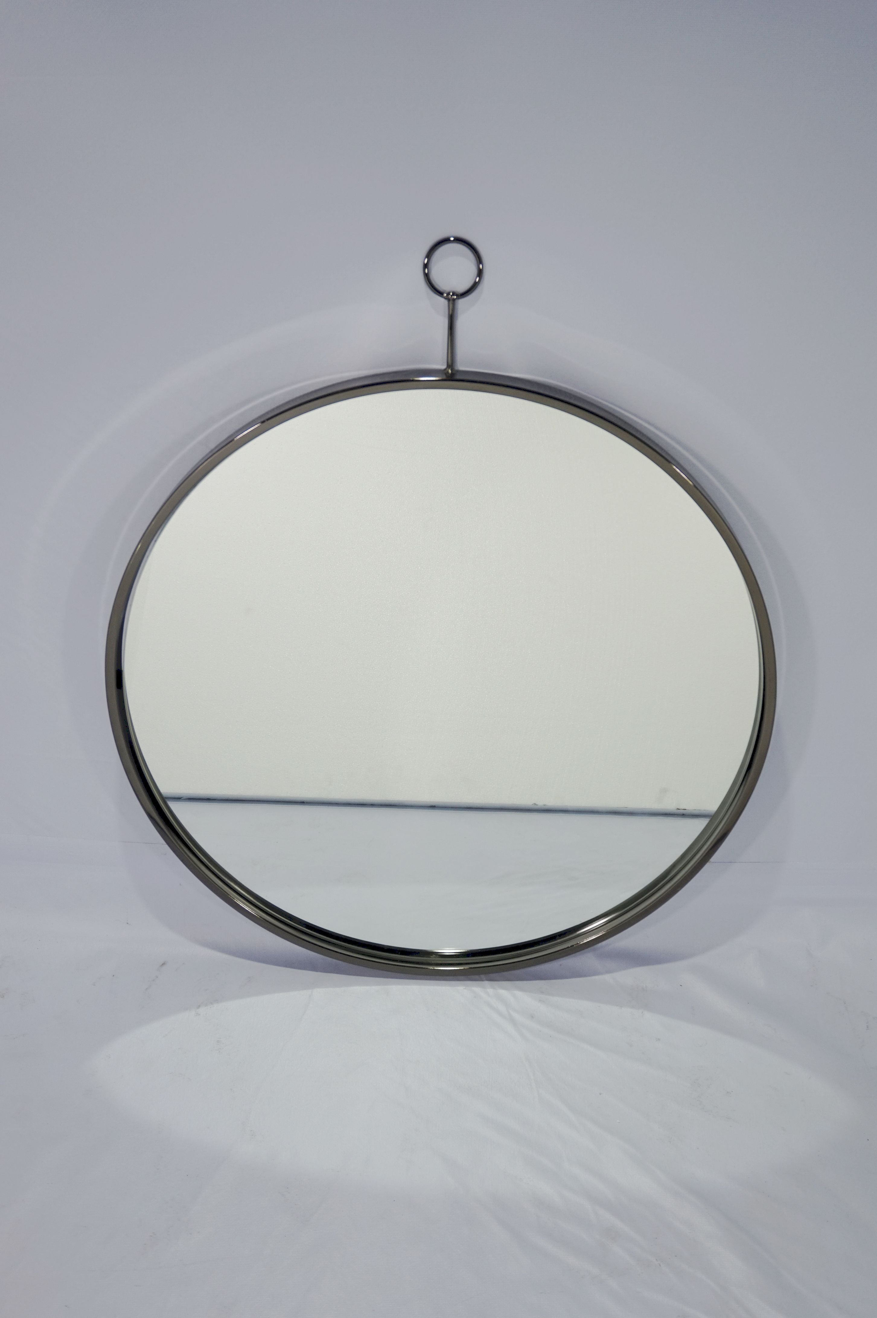 Understated elegance emerges in this round mirror. perfect for a modern farmhouse style space or home, this circular mirror boasts clean lines with a thin frame in a deep black nickel finish that delicately accentuates the silhouette of this charming wall decor. attached at the top is a metal loop hanger, inviting you to hang this mirror in an exposed, industrial method. mount it from an attractive hook or secure it with a rope or ribbon for a charming touch. in addition, this rustic-inspired mirror makes a lovely addition to an entryway foyer as well as a compact bathroom.