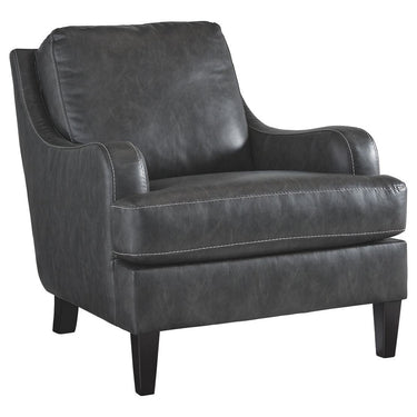 Turning heads with its unique blend of smooth lines and ruggedly handsome looks, this accent chair invites you to take a seat. High-quality faux leather upholstery is comfortably practical and affordable. Details including gently sloped arms accentuated by jumbo stitching incorporate a handsome punch of character.