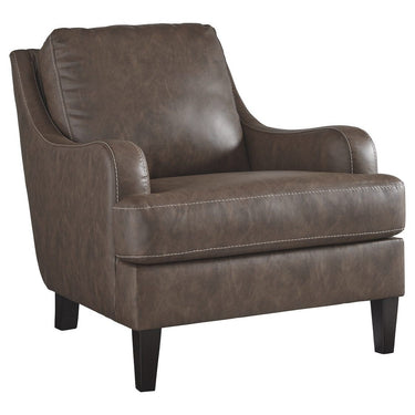 Turning heads with its unique blend of smooth lines and ruggedly handsome looks, this accent chair invites you to take a seat. High-quality faux leather upholstery is comfortably practical and affordable. Details including gently sloped arms accentuated by jumbo stitching incorporate a handsome punch of character.