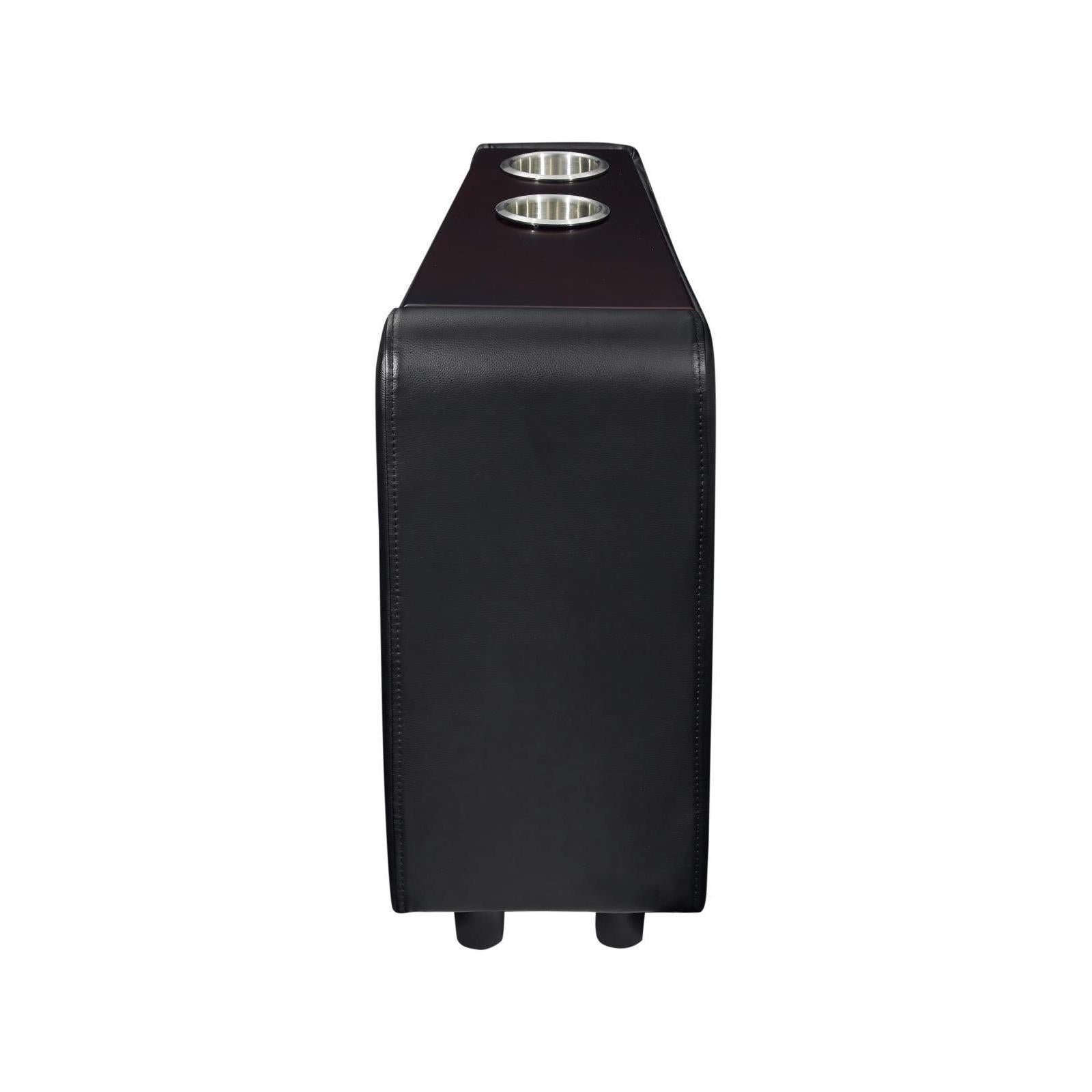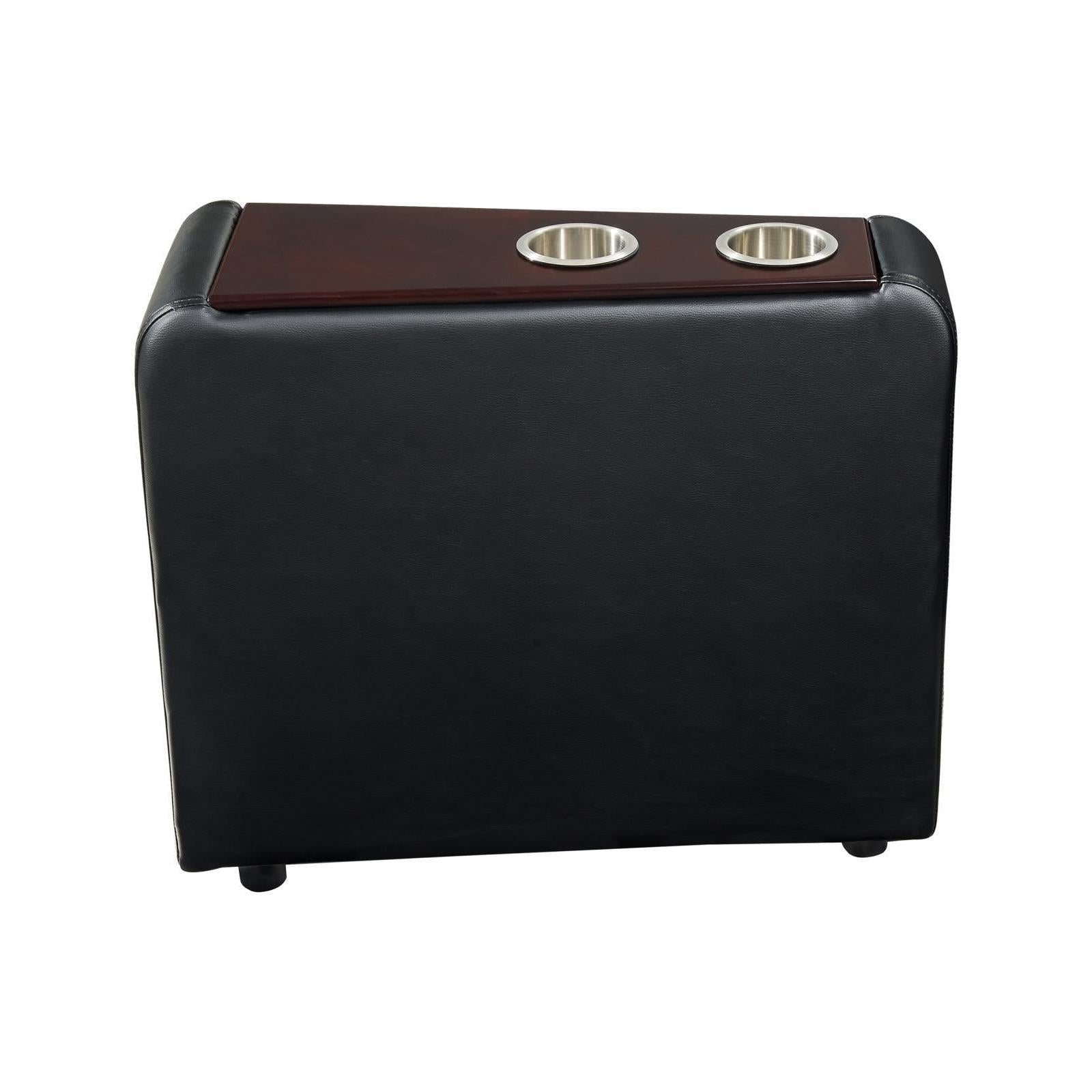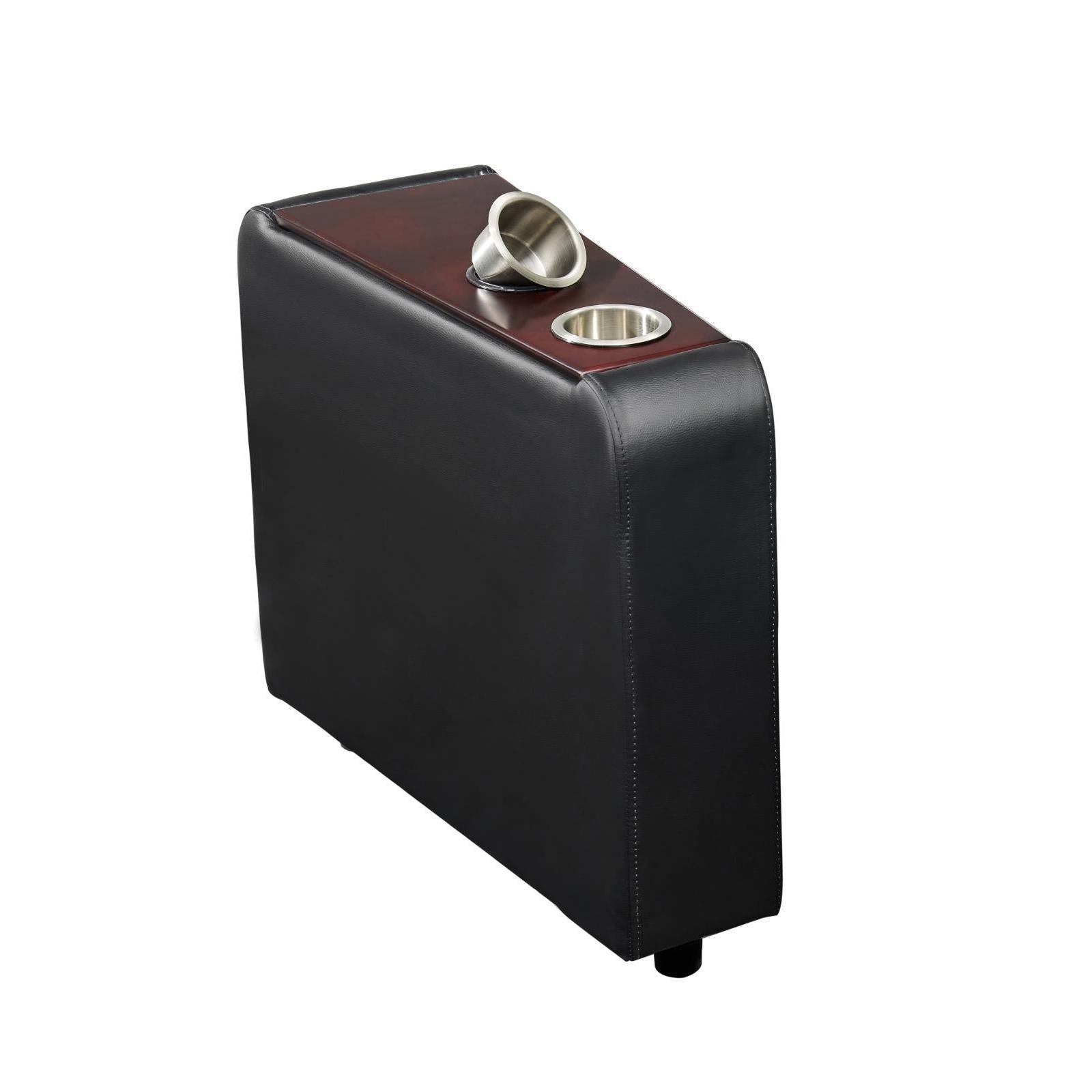 Unite a pair of theater-style recliners with this useful seating console. this think addition rests between two recliners. it offers two cupholders, perfect for a relaxing with a movie or binge-watching a new favorite. black faux leather lends a rich look and feel. create the ultimate home theater experience.