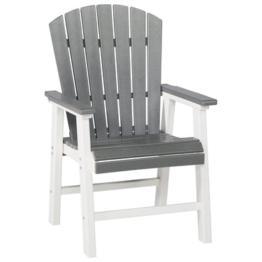 Pull up a chair on the back deck or poolside and gather around for good times. These two-tone outdoor dining chairs have sturdy legs in crisp white, with the arms, seat and back in a cool shade of gray. A slatted seat and back allow drainage to prevent rainwater buildup. Designed to withstand harsh weather, this comfortably casual outdoor duo is made with durable MEGA TUFF� HDPE material that won't chip, rust or peel.