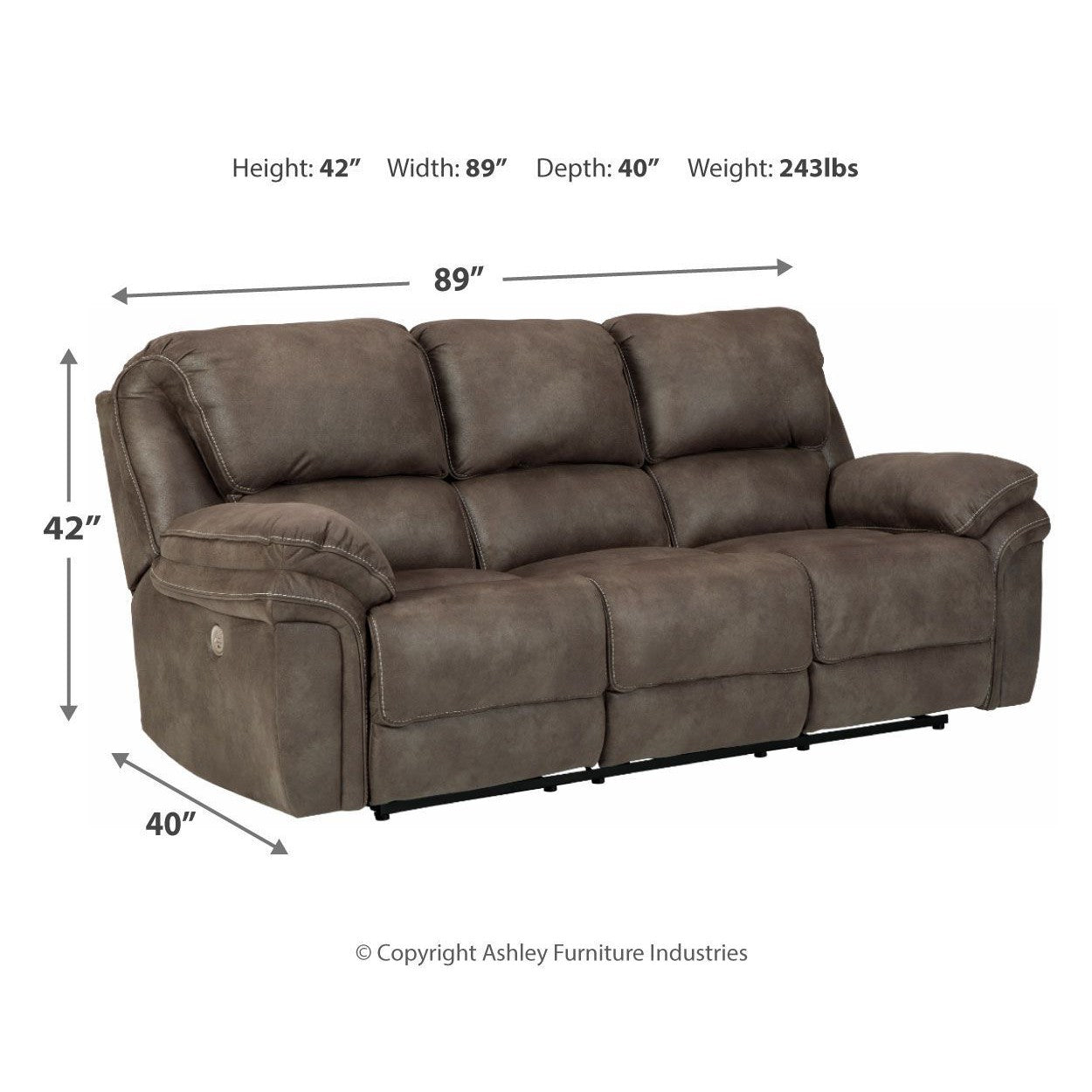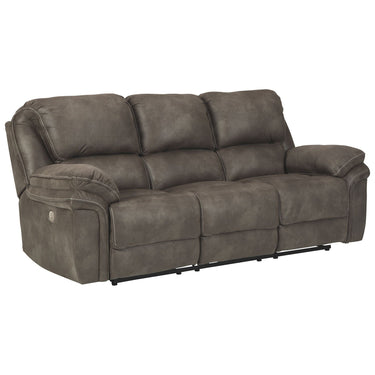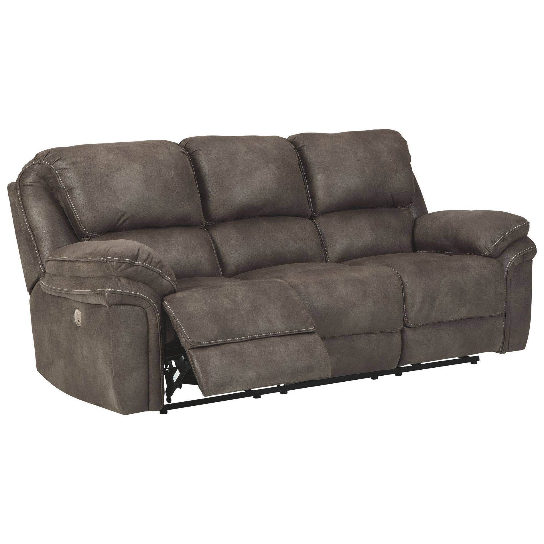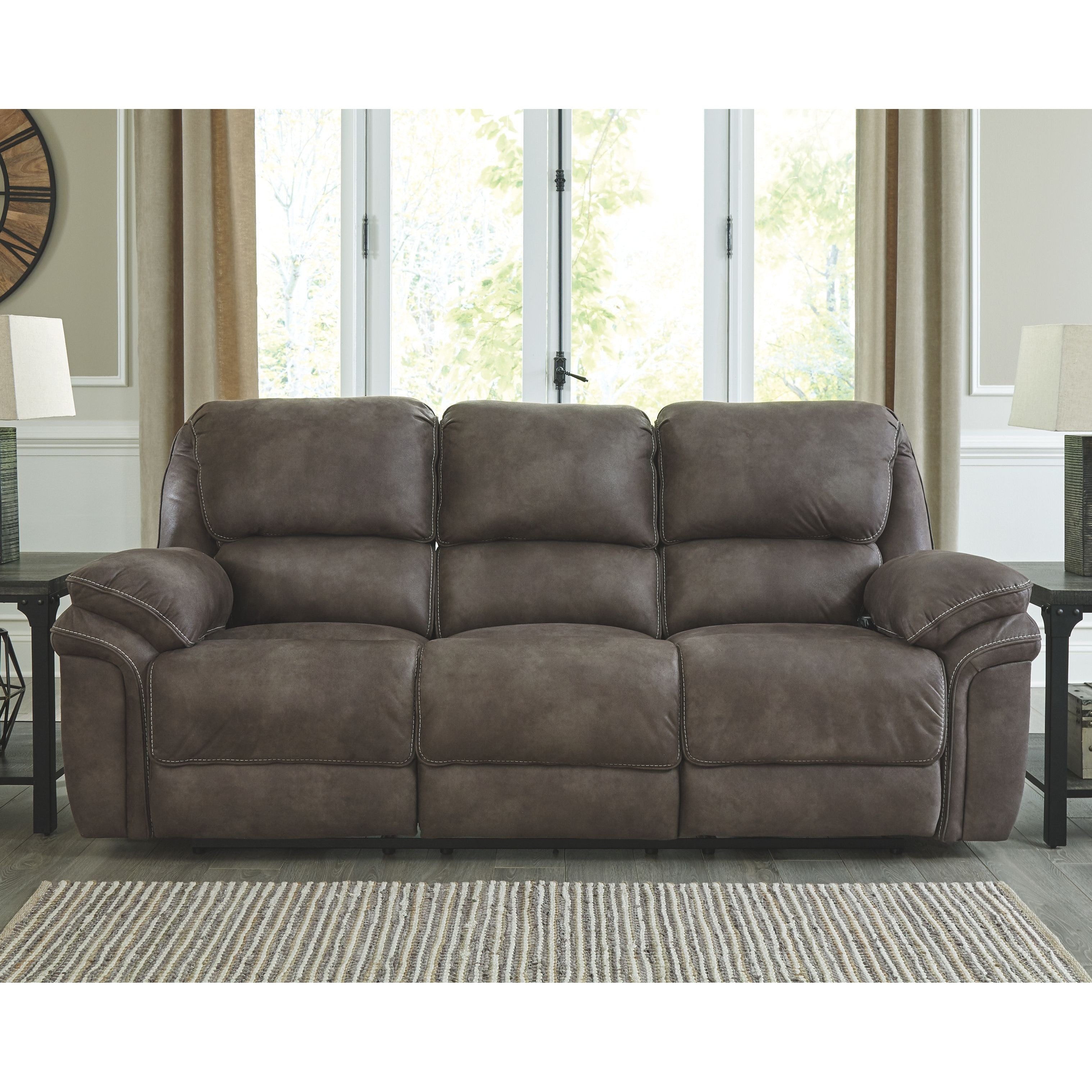 Get the cool leather look you love-and the cozy feel you crave-with this power reclining sofa in gorgeous graphite. Rest assured, this reclining sofa's padded faux leather suede with weathered distressing looks so much like the real thing. Unique design elements include high-contrast jumbo stitching that calls attention to the padded wraparound effect. And talk about pampering. Double padded armrests and back cushioning offer a level of cradling comfort that's second to none.