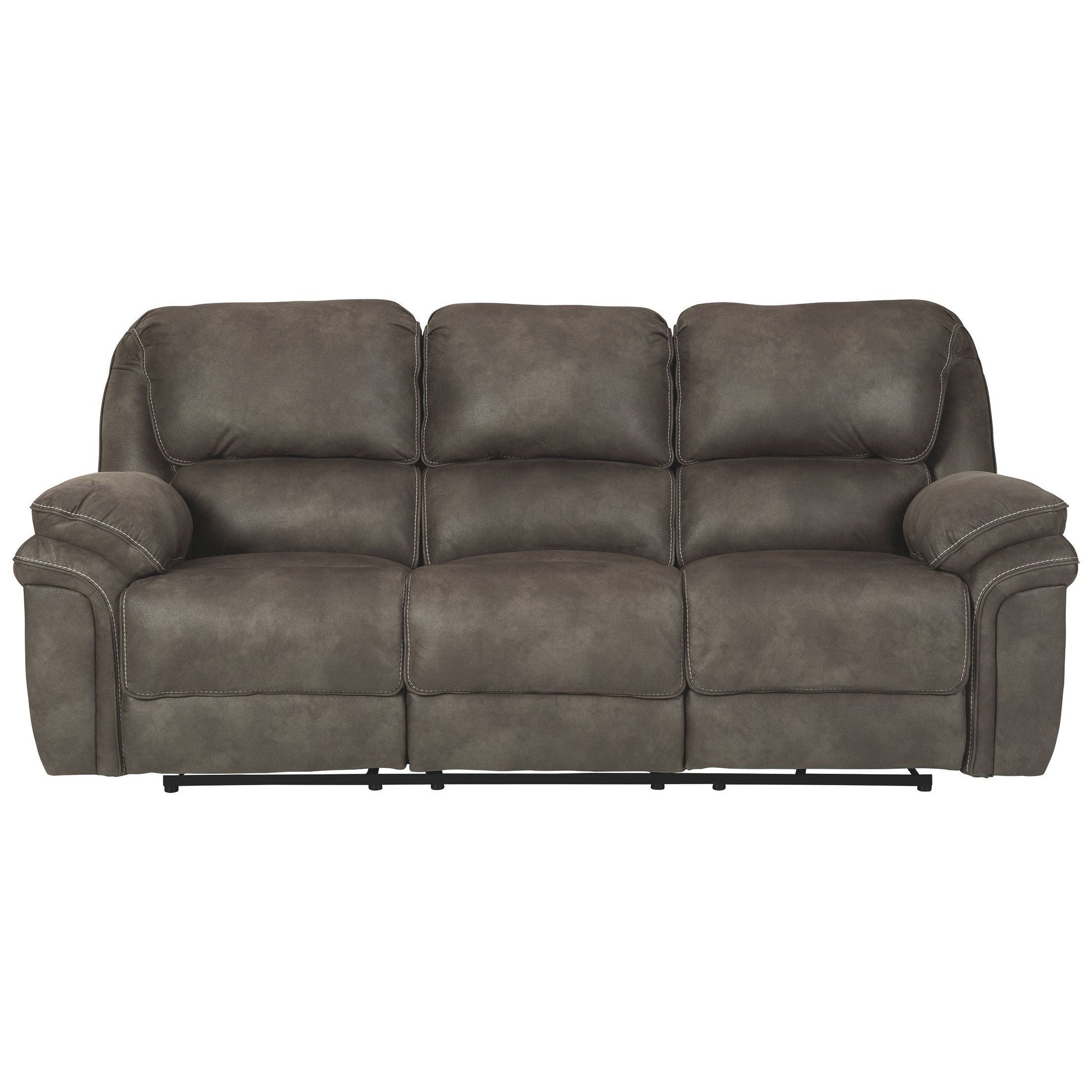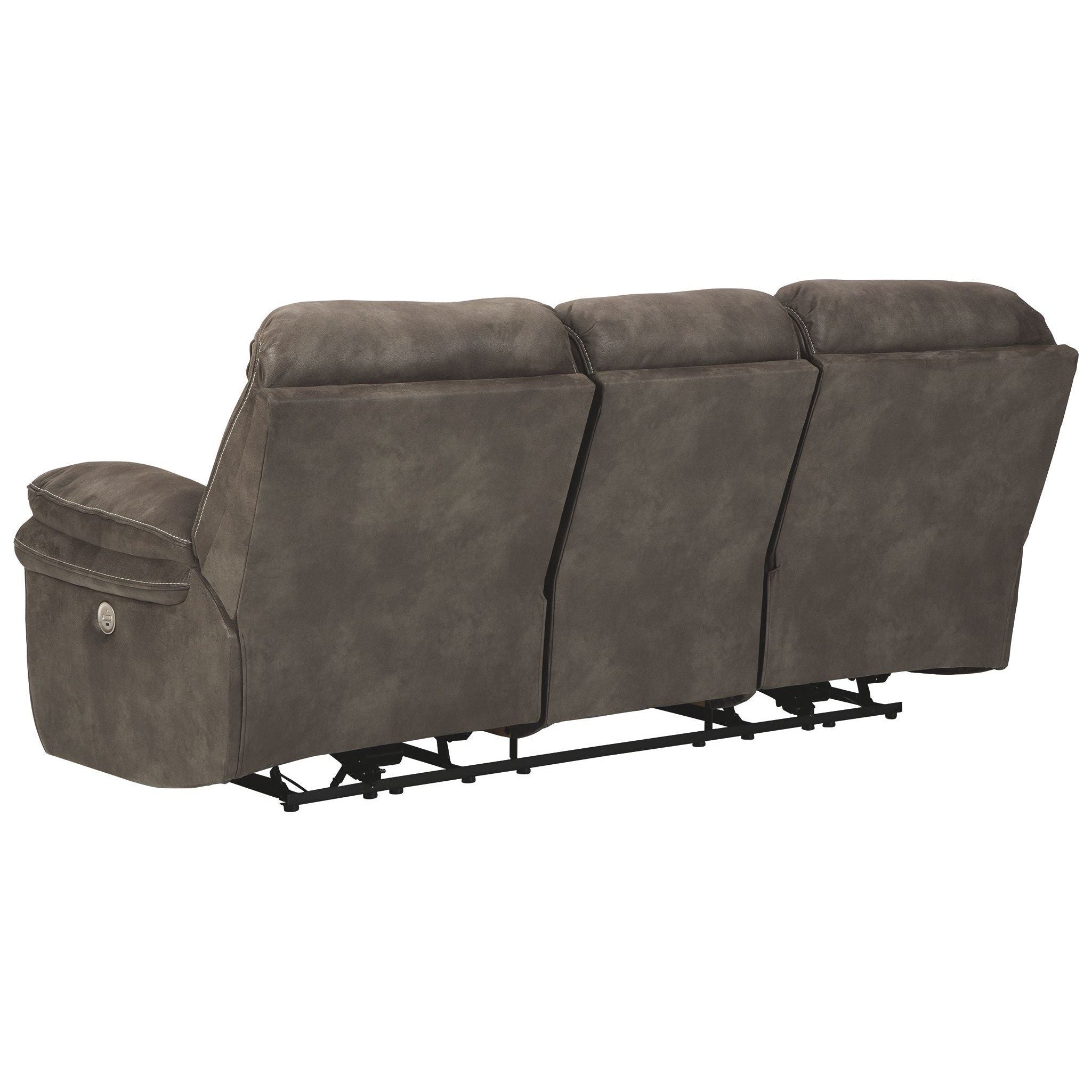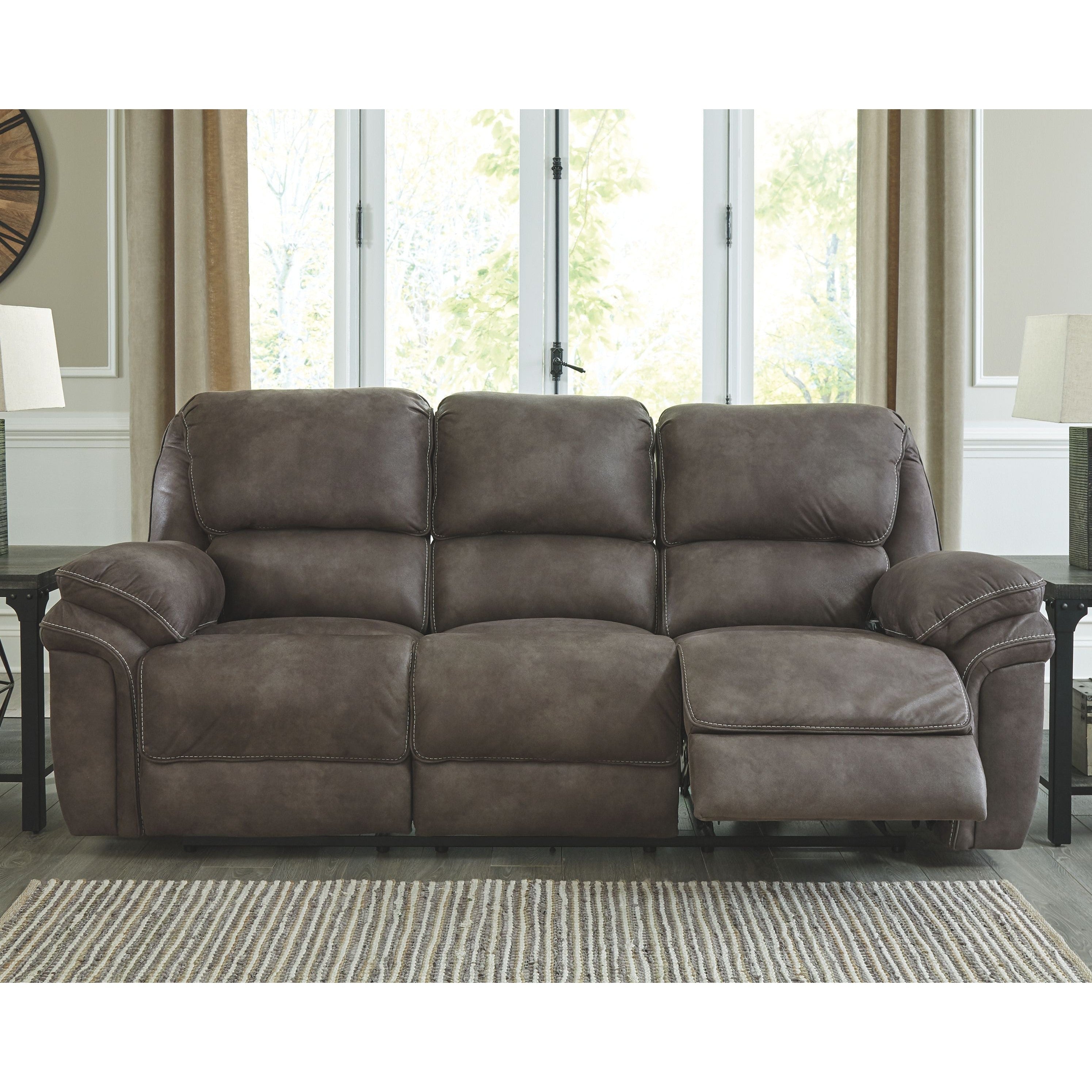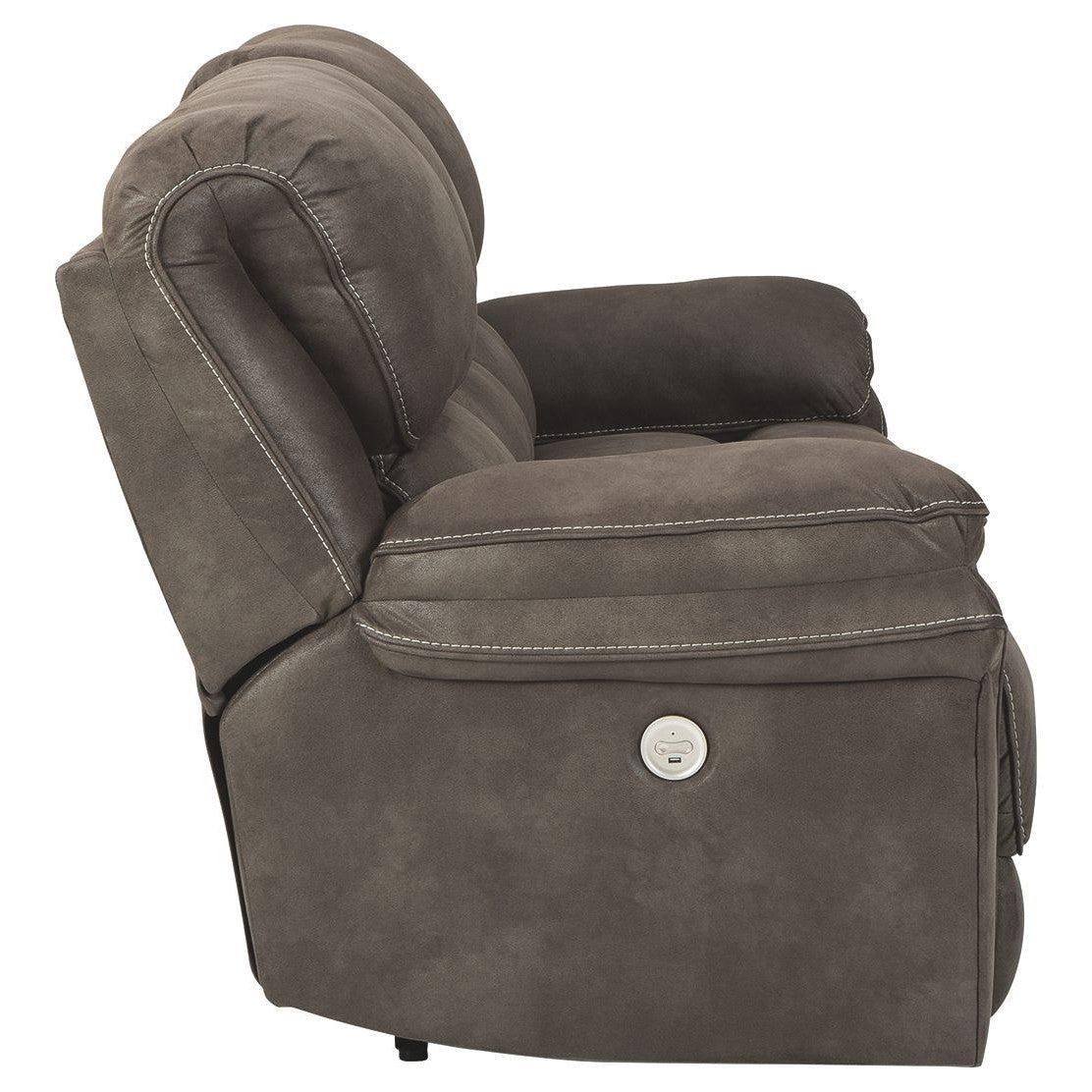 Get the cool leather look you love-and the cozy feel you crave-with this power reclining sofa in gorgeous graphite. Rest assured, this reclining sofa's padded faux leather suede with weathered distressing looks so much like the real thing. Unique design elements include high-contrast jumbo stitching that calls attention to the padded wraparound effect. And talk about pampering. Double padded armrests and back cushioning offer a level of cradling comfort that's second to none.