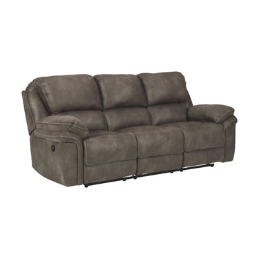 Get the cool leather look you love-and the cozy feel you crave-with this reclining sofa in gorgeous graphite. Rest assured, this reclining sofa's padded faux leather suede with weathered distressing looks so much like the real thing. Unique design elements include high-contrast jumbo stitching that calls attention to the padded wraparound effect. And talk about pampering. Double padded armrests and back cushioning offer a level of cradling comfort that's second to none.