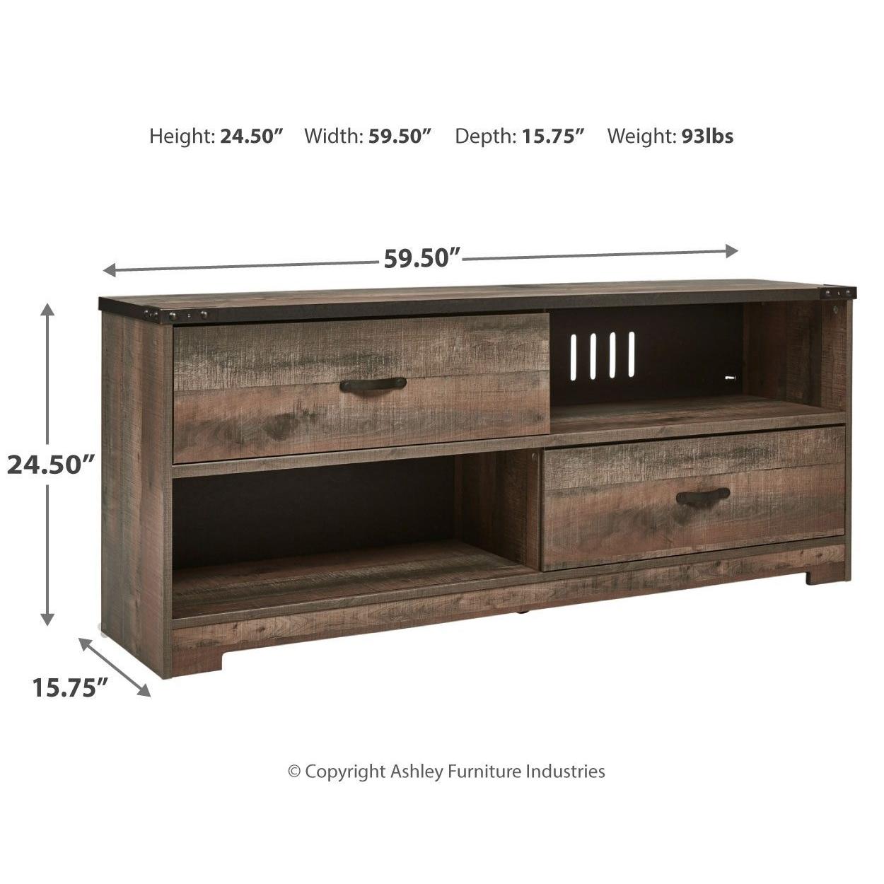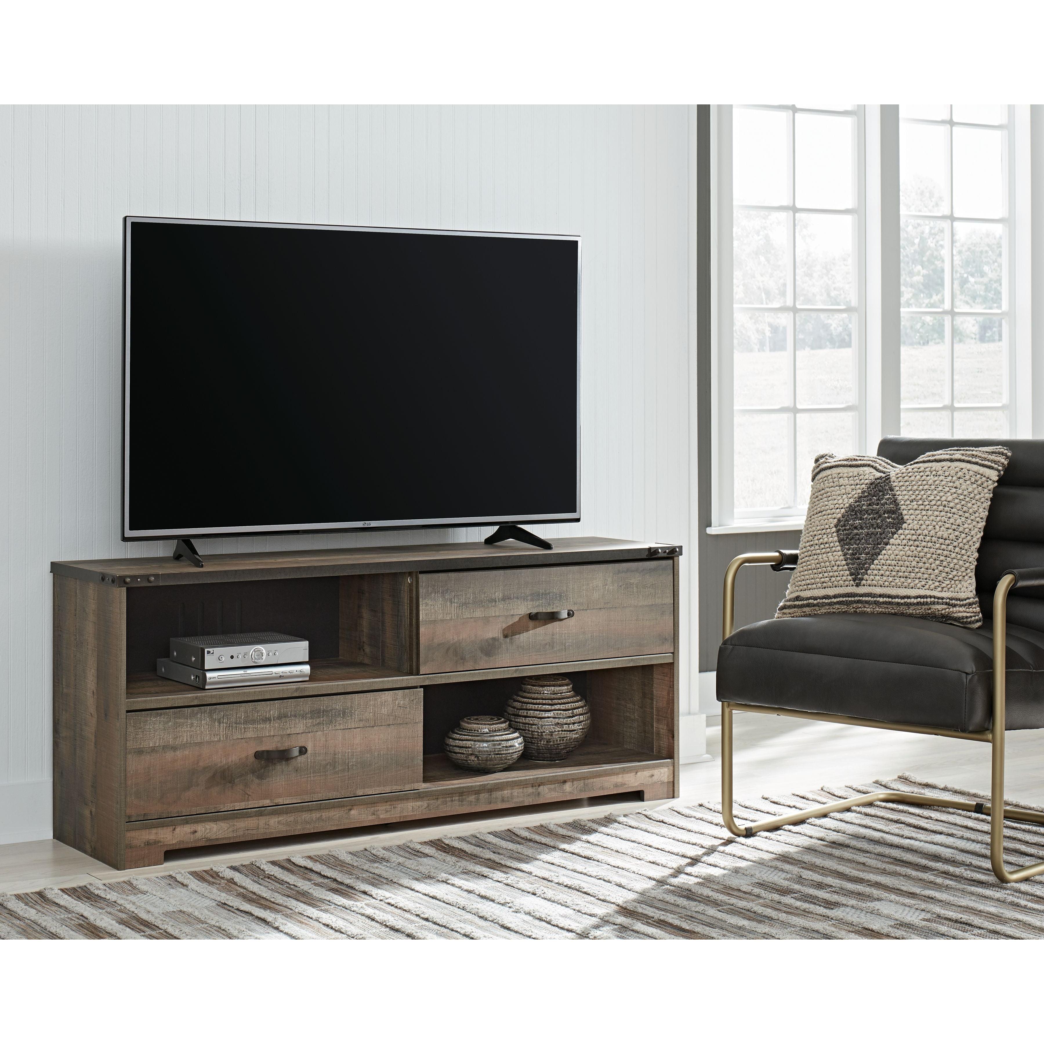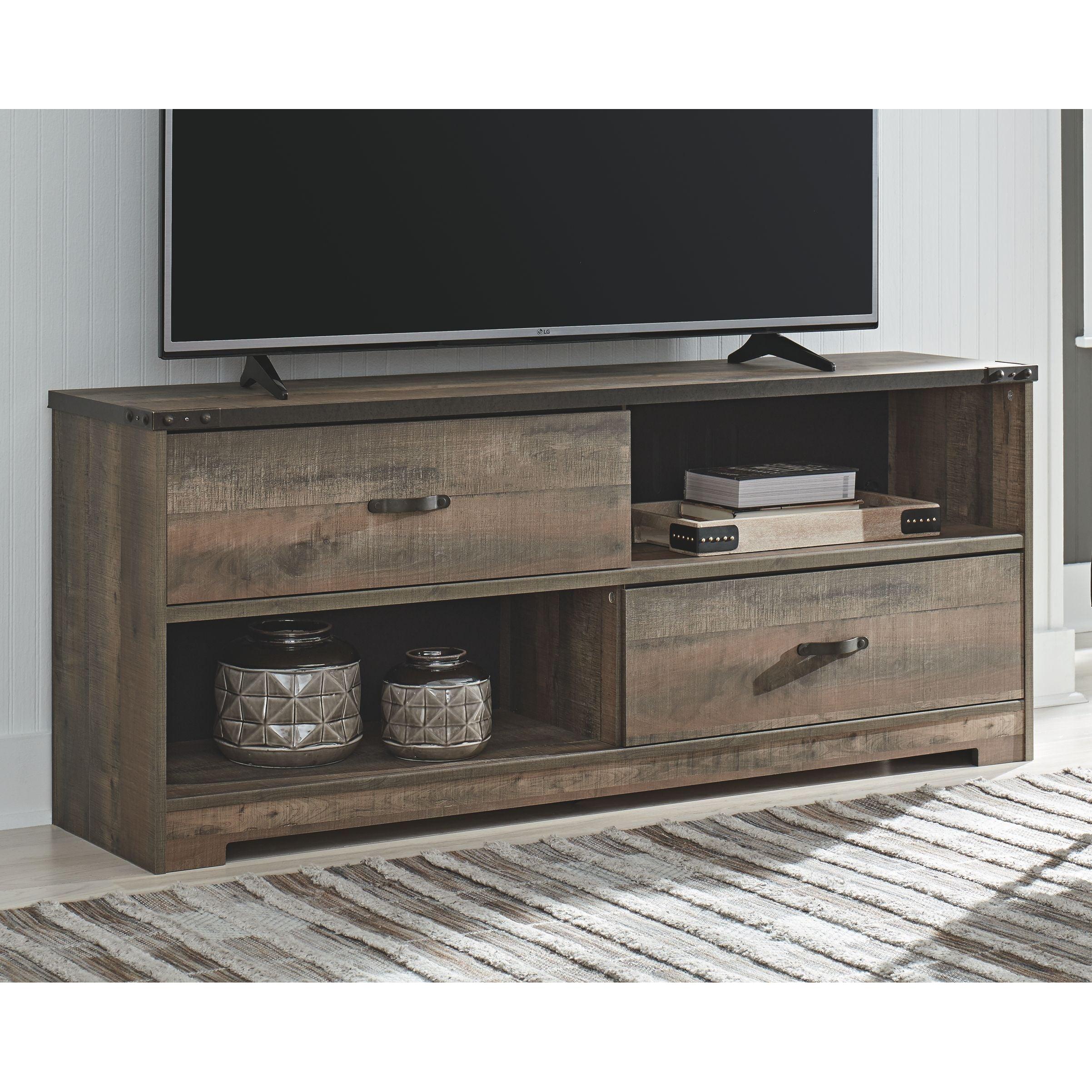 Entertain a rugged yet refined sense of style with this TV stand. Rustic finish and plank-style details pay homage to reclaimed barn wood, while faux metal banding with nailhead accents infuses a touch of industrial cool. Ultra clean lines ensure a look that can go from the country to the city and feel equally at home.