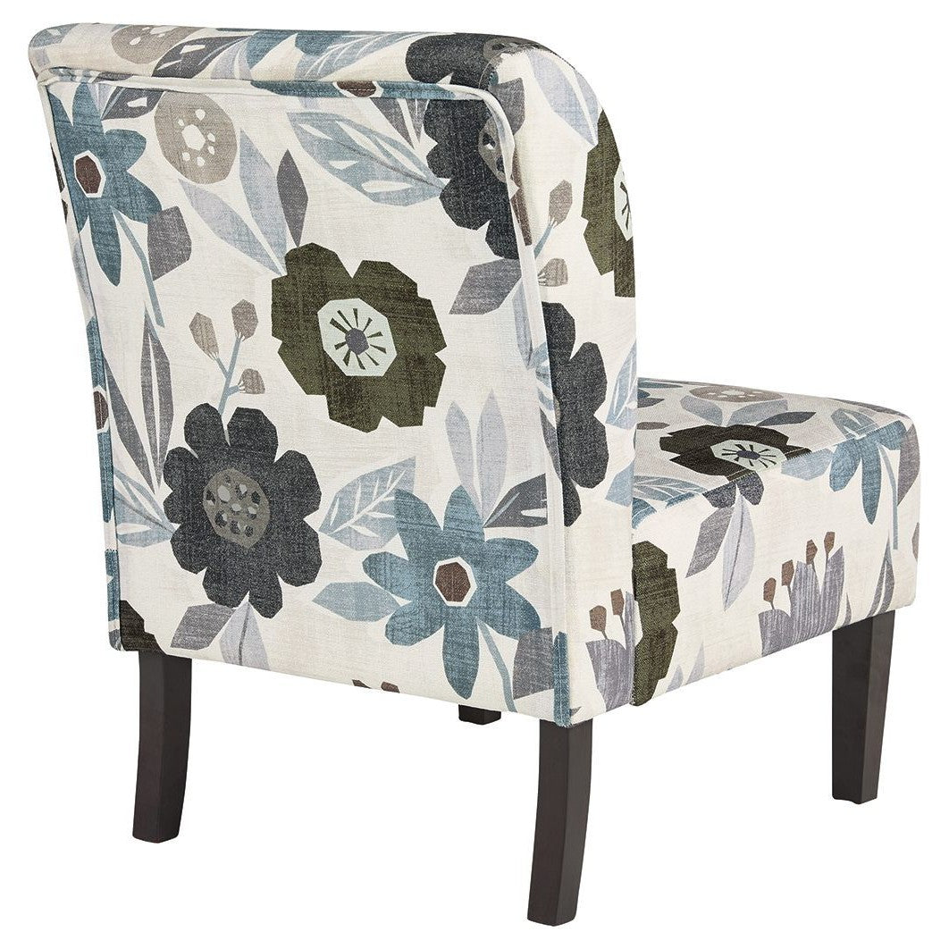 This fashion-forward accent chair adds a cool vibe to your home. Armless design is perfect for small spaces that need a spark of color. The ivory, blue, charcoal and brown floral-patterned upholstery will brighten your space and bring in an element of comfort.