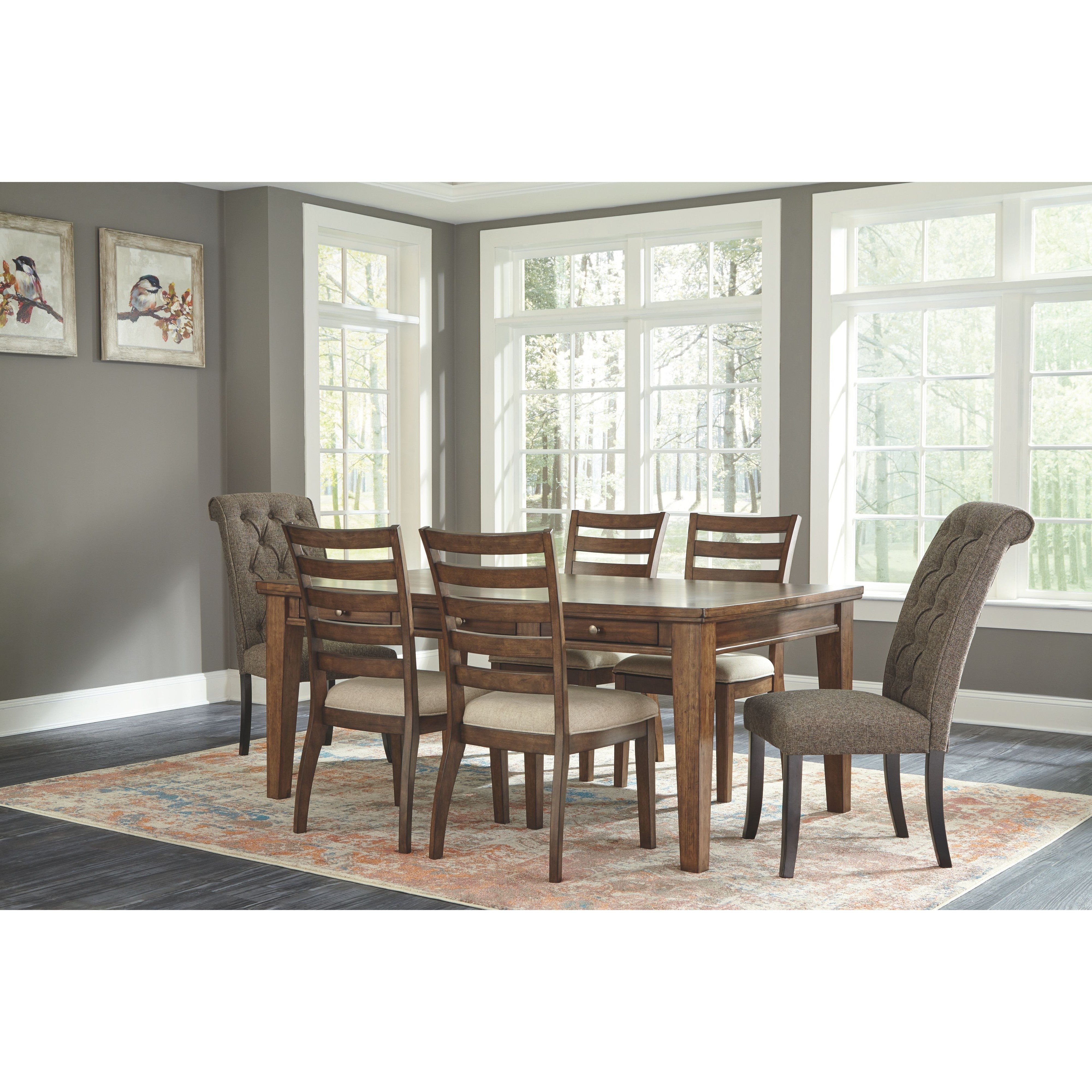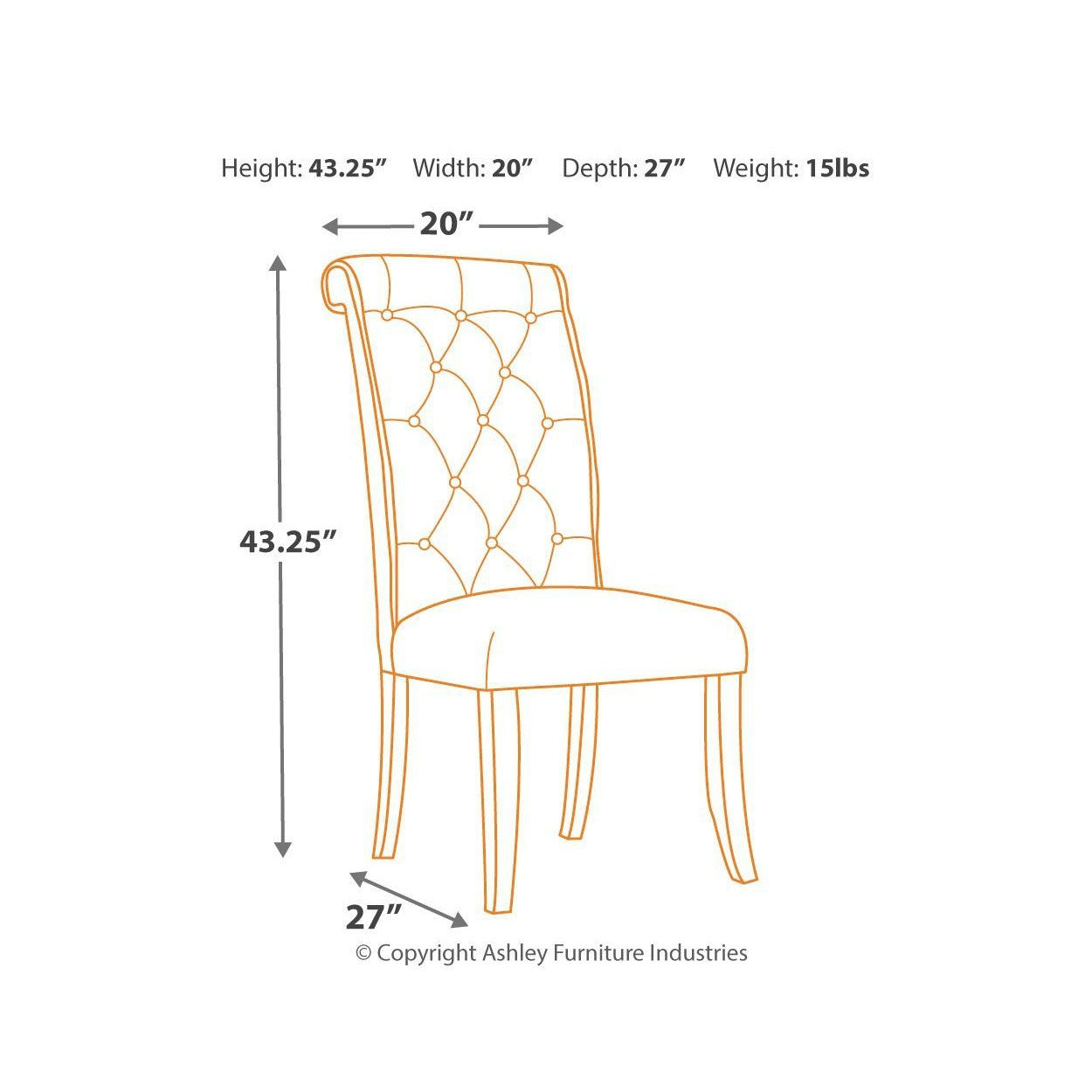 This side chair arrives at the table with the full-scale comfort of a favorite living room chair. Classic tufting dresses up the high, beautifully curved back. Both seat and back are firmly cushioned and covered in a textured upholstery