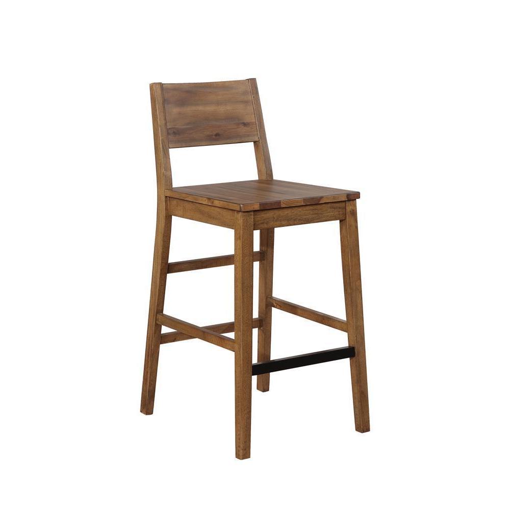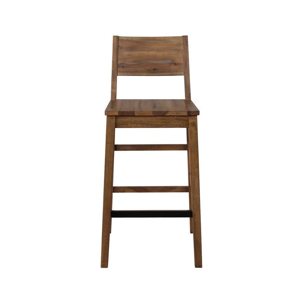 Stunningly modern, this bar stool features rustic details to give any space a rustic inspired feel. elongated and open lines marry to create sleek legs in a varied natural finish. planks of wood adorn the seat and back for to give this seat its charming personality. sit around a bar table or at a kitchen counter in style. dress up any space with the texture and lines from this modern, cabin-inspired stool.