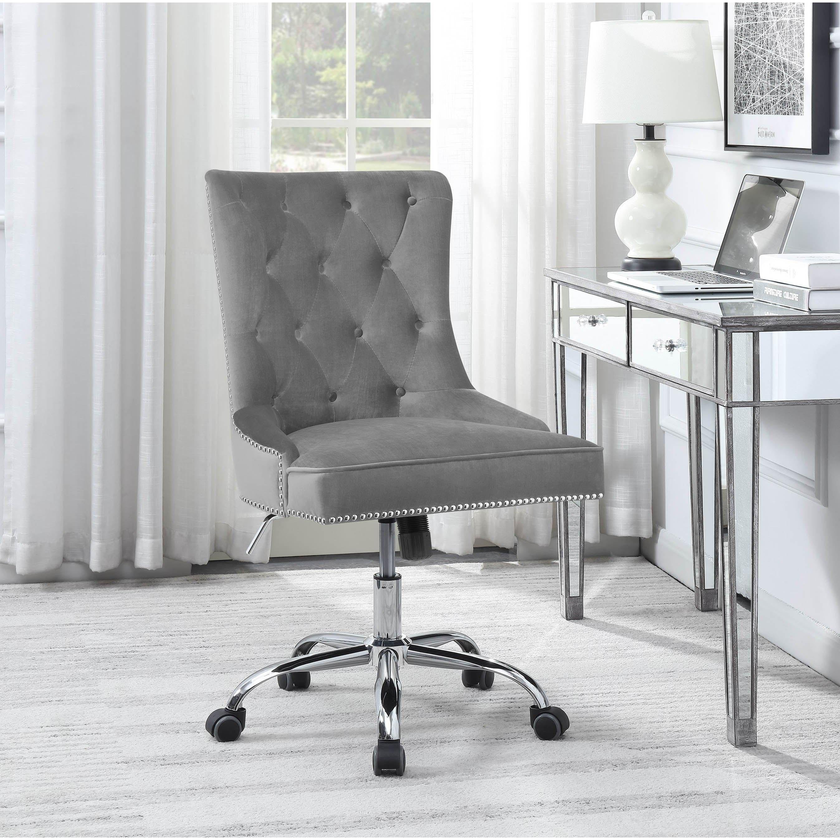 Add versatile convenience to your work space with this stunning swivel office chair. with built-in casters and handy height adjustability, it allows you to perfectly position yourself for productivity. the luxurious texture of grey velvet upholstery infuses it with exquisite comfort. shiny, round, silver embellishments adorn its base and armrests, while button tufting adds a chic element of style. its shining chrome base pulls its luxe look together in spectacular fashion.