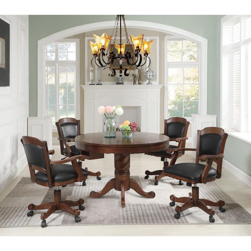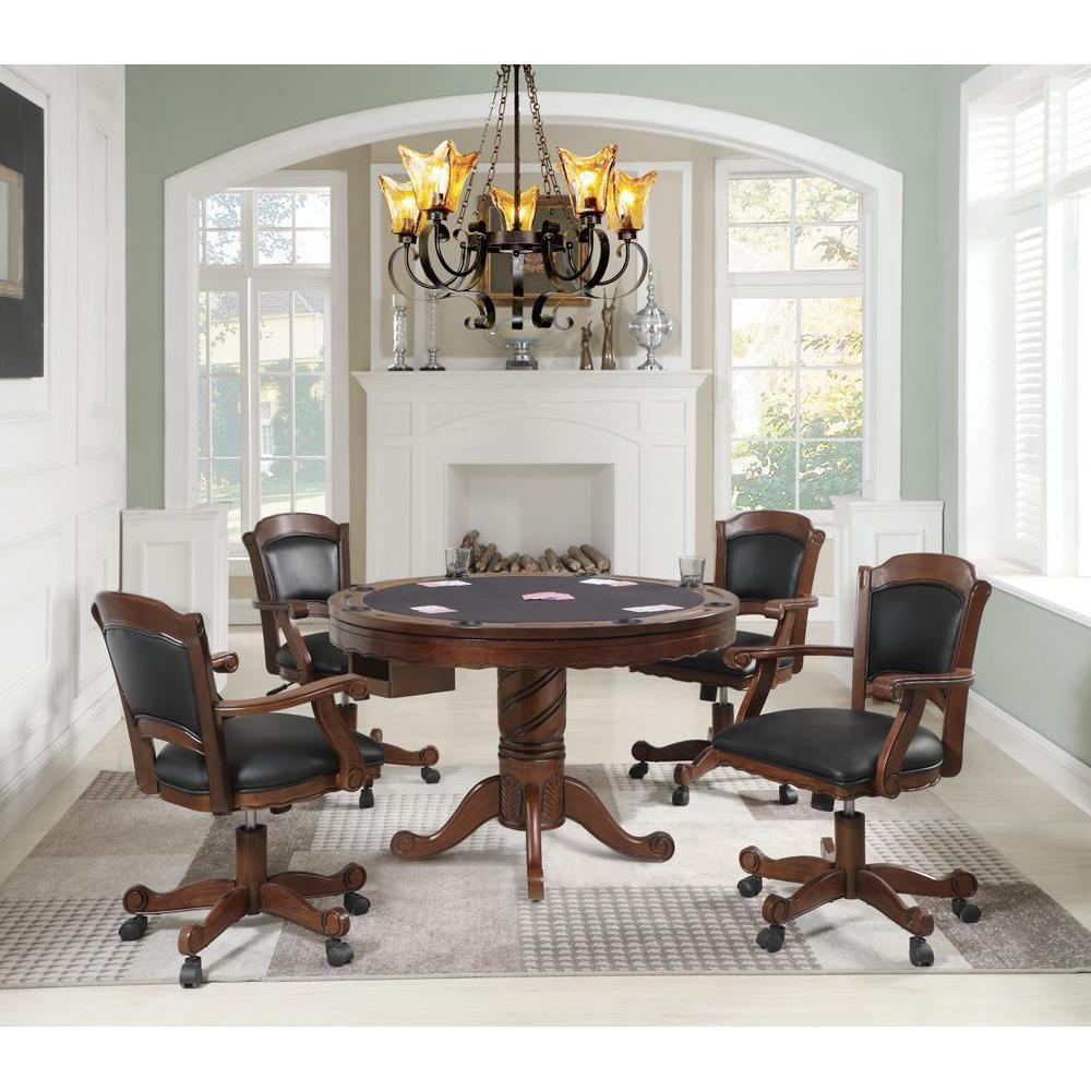 The height of elegance brings romantic character. dress up an entertainment space with this beautiful game chair. incredible attention to detail covers all bases with romantic curved accents and scalloped edges. with a tobacco finish and black leatherette seat cover, it extends a versatile and enticing look. caster wheels aid in movement for game night.