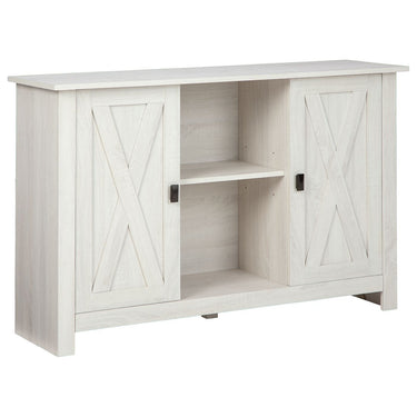 Casual and vintage style meet to make this accent cabinet. Two open storage cubbies allow you to feature decorative pieces or photographs and additional concealed space behind two doors provides an excellent storage solution. The crossbuck pattern door front adds a vintage feel, while the antiqued white wood laminate makes this a versatile addition to your space.