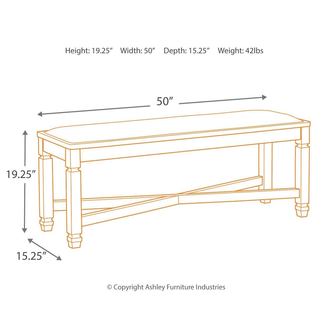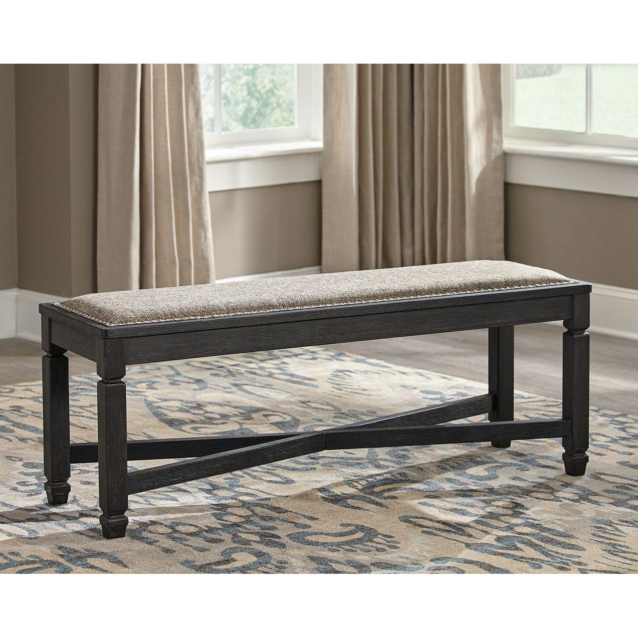 Invite your family into the heart of your home with this upholstered dining room bench. X-shape stretcher and tapered legs are a sturdy foundation. Black finish is beautifully textured. Heavily woven fabric has a quality feel-good touch. Silvertone nailhead trim is decorative without all the fuss. This is trend-right urban farmhouse style.