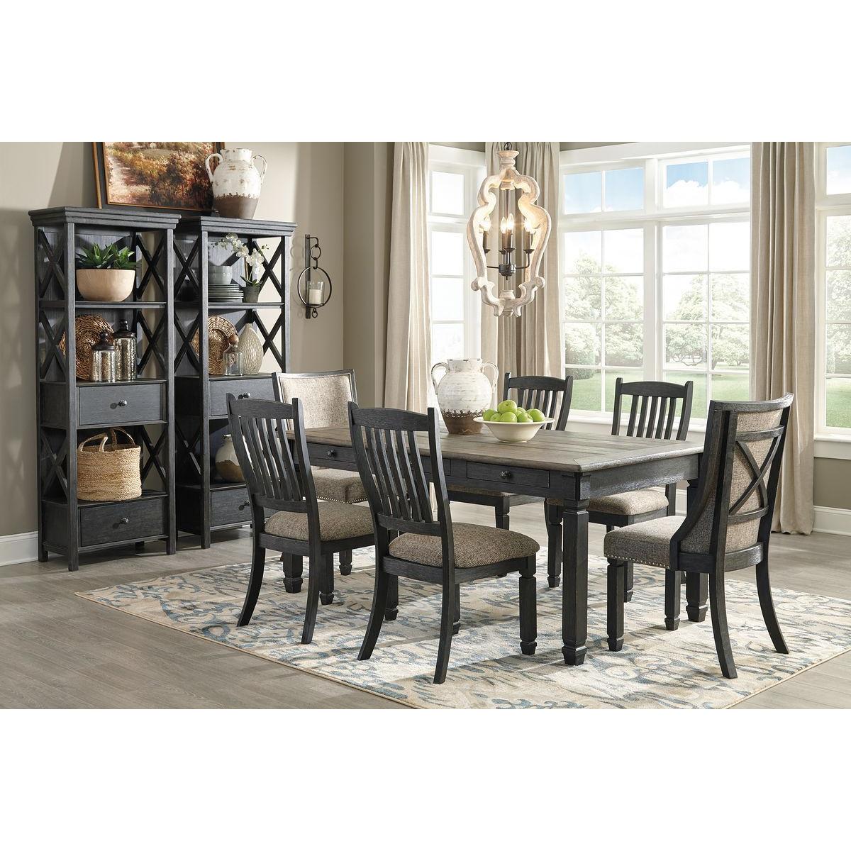 Unique two-tone finish with a combination of Oak and Acacia substrates combining a trendy textured antique black color with table and server tops finished in a textural weathered oak finish. Rectangular dining table features six convenient drawers for storing smaller items. The -02 upholstered host chair inspired by the trendy deconstructed styles for casual living. The -01 side chairs feature a boxed cushioned seat. All chairs feature a heavy woven grayish brown fabric for added textural qualities. The large capacity server has three doors with lattice design. The tall bunching unit has two drawers, three shelves and open lattice sides.
