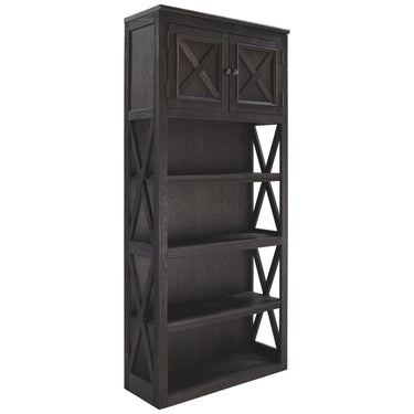 Shabby chic with a hint of down home country is what gives this large bookcase standout style. Appealing to today's more relaxed sensibilities, it's got a richly rustic, textured black finish for an easy-elegant aesthetic. Trio of roomy shelves and double door cabinet with shelved storage put office essentials well within reach.
