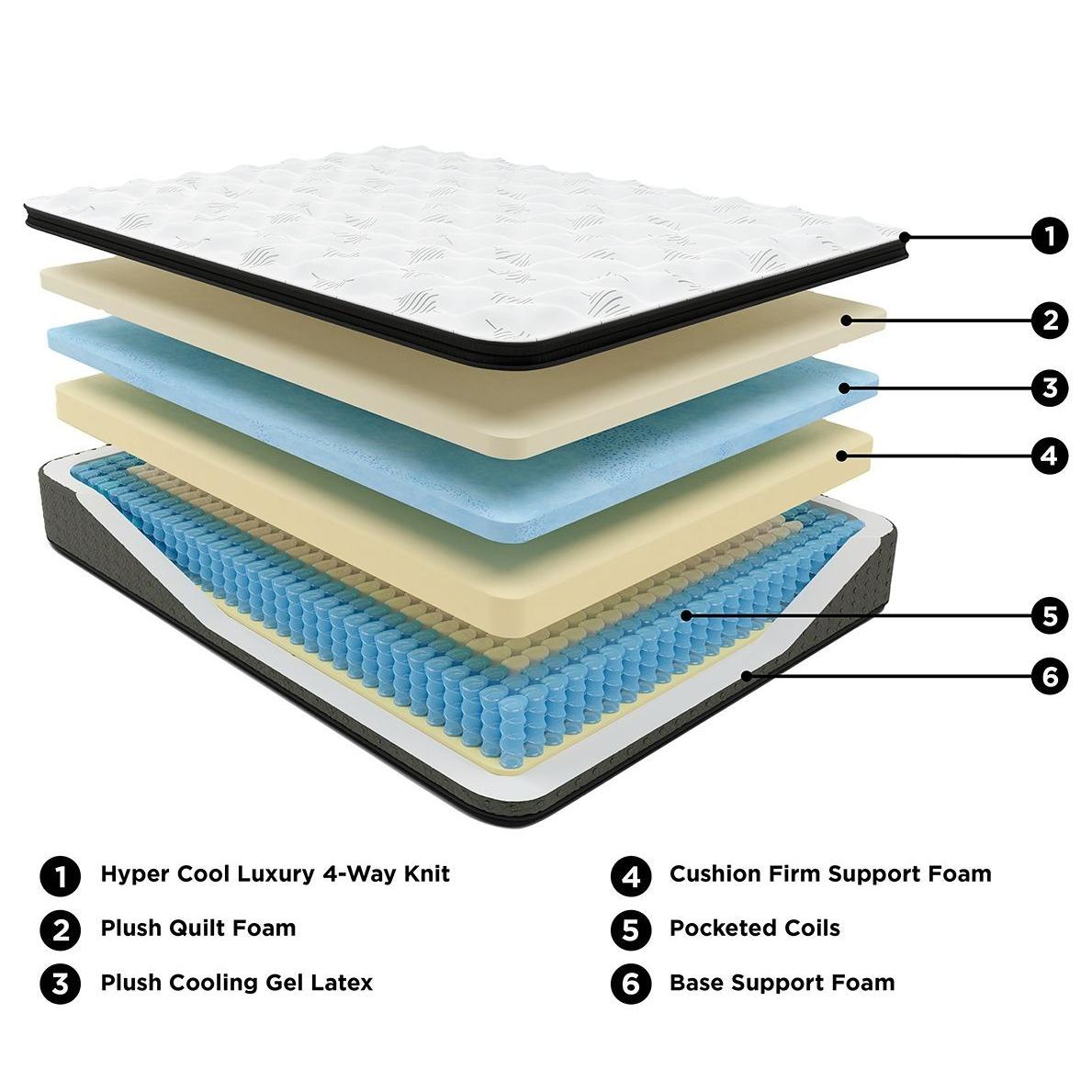 Enjoy endless possibilities for restful sleep with the Ultra Luxury pillow top mattress with hyper-cool technology. You get the best of both worlds with this hybrid innerspring mattress: the pressure relief of cooling gel-infused latex foam, coupled with body contouring pocketed coils for superior support. Rest assured that high-density quilt foam provides the comforting feel you love. Plus, this mattress arrives in a box for quick, easy setup. Just cut away the plastic wrap and unroll it. Foundation/box spring available, sold separately.