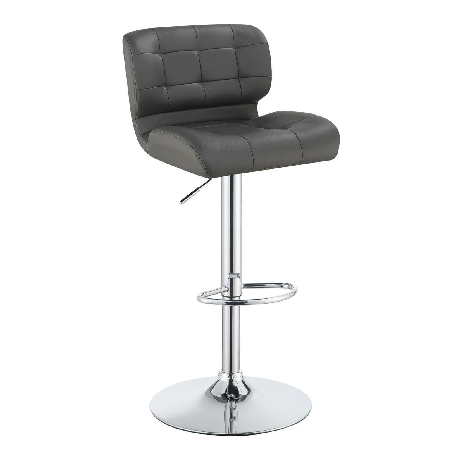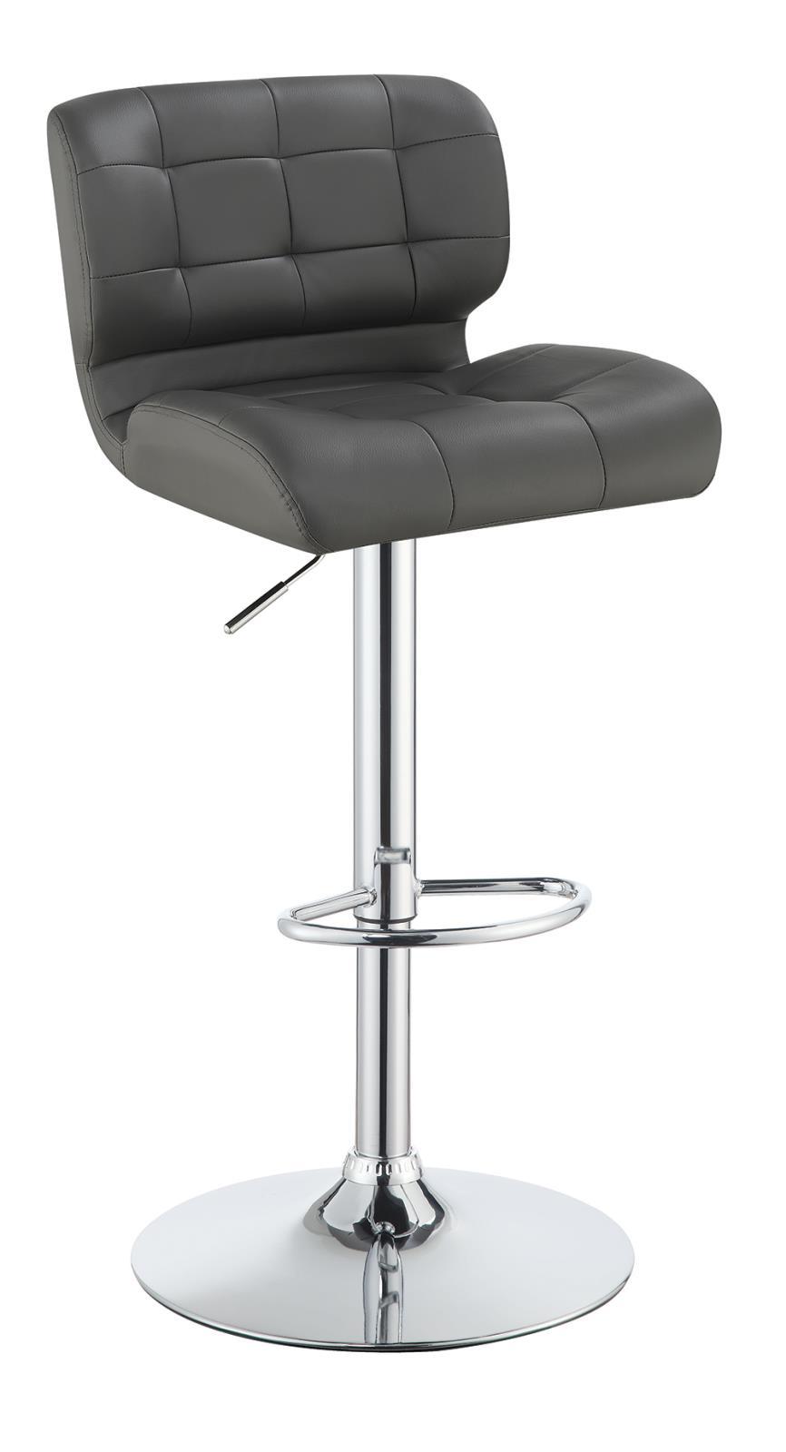 Relax in style with the luxurious feel and elegant appearance of this contemporary bar stool. its thick, padded seat and perfectly placed foot pedestal make it an exceedingly comfortable choice. the seat is upholstered in smooth, grey, leather-like material and embellished with stylish rivets and tufting. a glimmering chrome finish completes its sophisticated look. height adjustable, it accommodates a wide variety of tables, counters, and bars for convenient versatility.