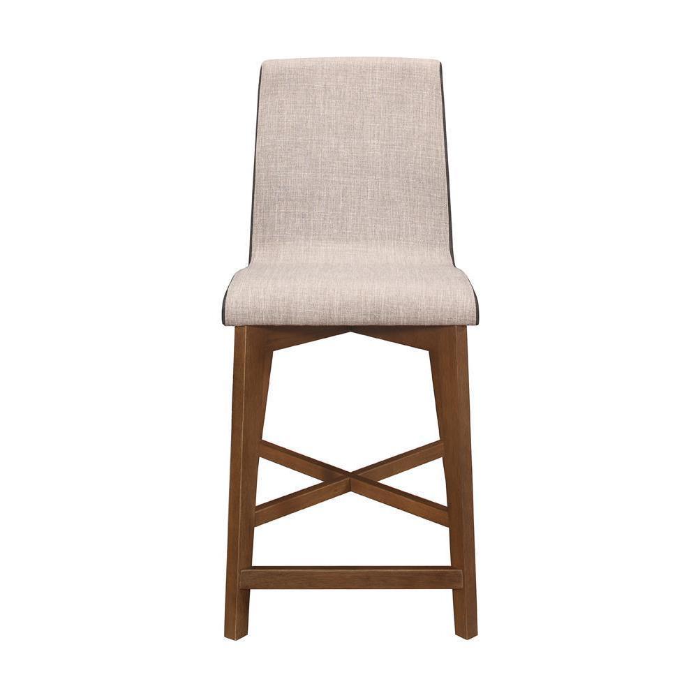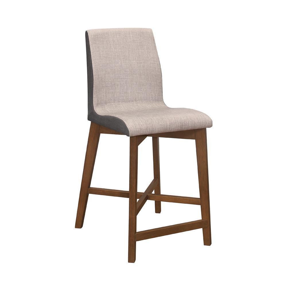 Place this pair of two counter height stools in a mid century modern home for a more retro-inspired look. perfect for the green-friendly home, each stool offers a molded-like cushioned seat with comfortable and long-lasting foam filling. each chair seat is also upholstered in a two-tone design of both light grey and dark grey fabric. supported by tall and flared narrow legs, each chair also offers a foot brace for extra support. the natural walnut finish lends retro, mid-century vibe.